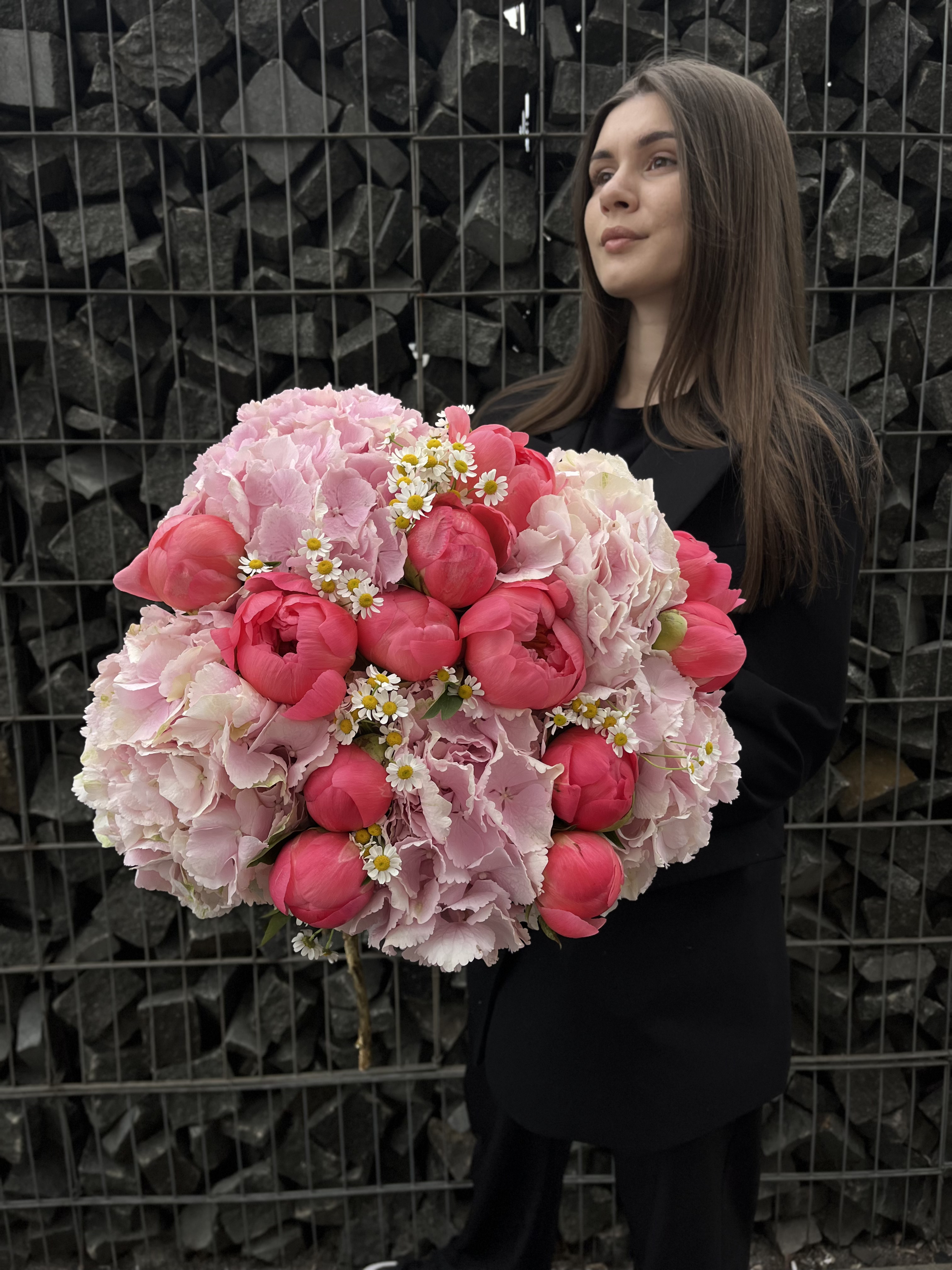 Витончений букет з гортензій, півоній та танацетуму - ідеальний вибір для створення романтичного настрою! Для зручності та захисту квітів під час доставки використовуємо коробку для транспортування, також додаємо підживку для довшого зберігання букету. Доставка по Луцьку та області.
