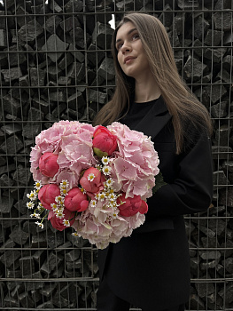 Витончений букет з гортензій, півоній та танацетуму - ідеальний вибір для створення романтичного настрою! Для зручності та захисту квітів під час доставки використовуємо коробку для транспортування, також додаємо підживку для довшого зберігання букету. Доставка по Луцьку та області.