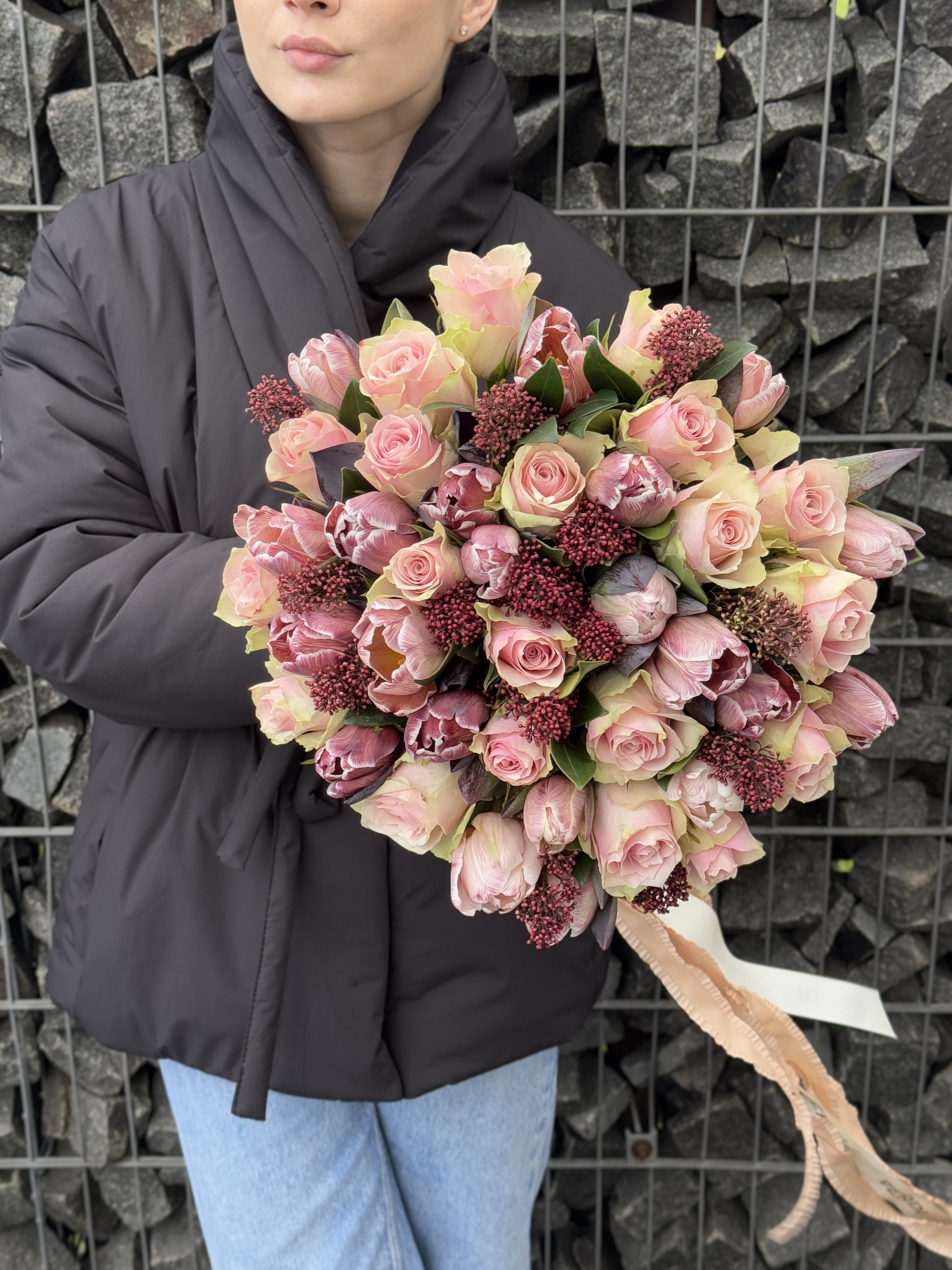 Відкрийте для себе чарівну красу наших букетів. Ця приголомшлива композиція створює елегантність тюльпанів, ніжну романтику рожевих трояндів та унікальну текстуру шкіри, створюючи гармонійний баланс кольору та шарму. Ідеальний для будь-якої події, цей букет додає нотку вишуканості до вашого дня!