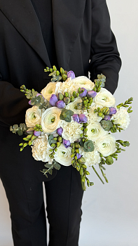 Витончений та ніжний букет у світлих тонах, що поєднує в собі багатошарові білі ранункулюси, пишні білі гвоздики та витончені гілочки бузкової фрезії. Акценти з сизого евкаліпту додають композиції об'єму та легкого освіжаючого аромату. Цей букет виглядає надзвичайно елегантно завдяки поєднанню класичних форм та ніжних кольорових переходів.