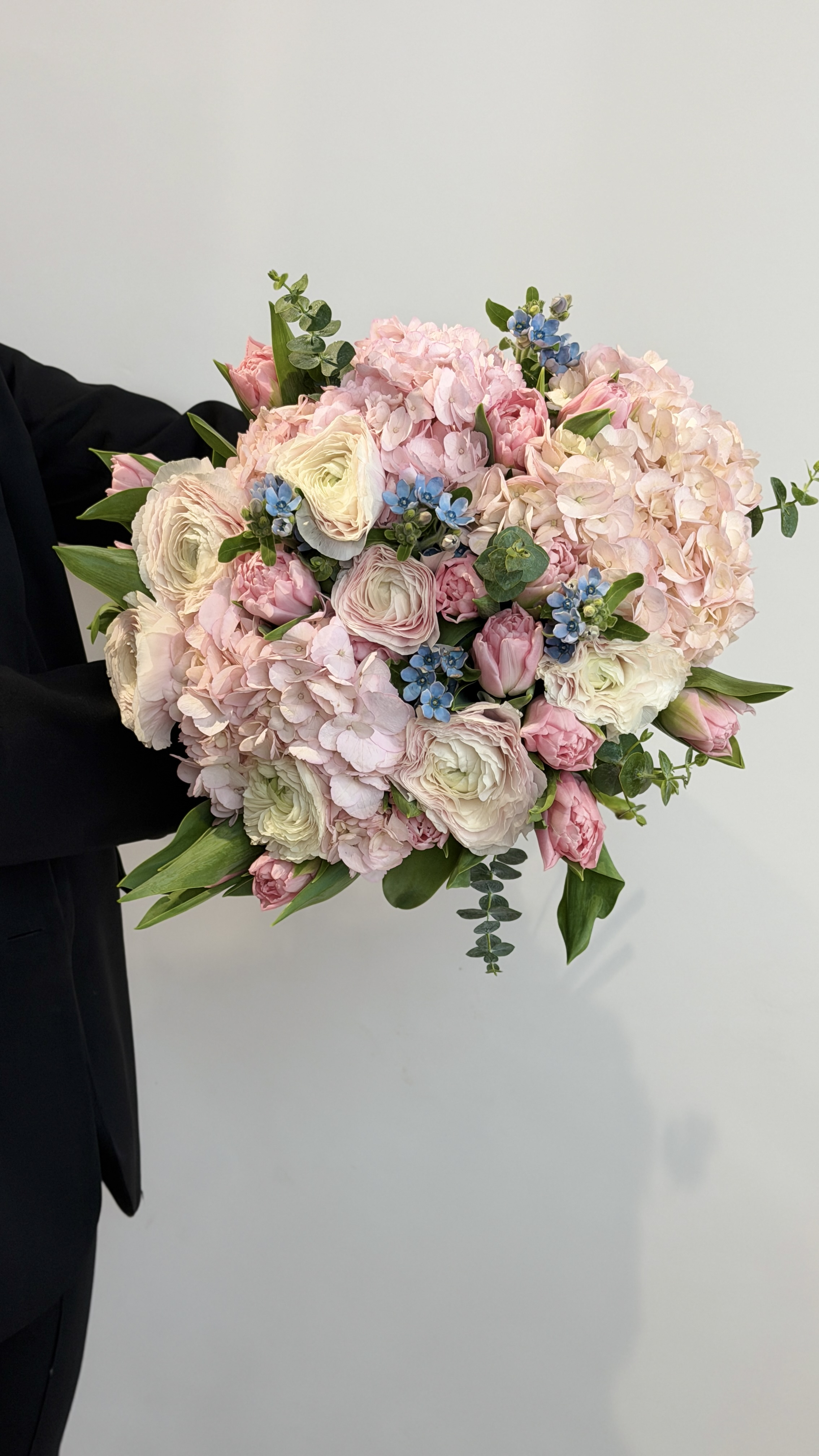 Повітряний та вишуканий букет у пастельних відтінках, що поєднує об’ємні суцвіття ніжно-рожевої гортензії, елегантні ранункулюси та тендітні рожеві тюльпани. Особливого шарму композиції додають дрібні блакитні квіти оксипеталуму, які створюють ледь помітний, але стильний колірний акцент. Декоративні гілочки евкаліпту завершують образ, додаючи букету природної динаміки та легкості.