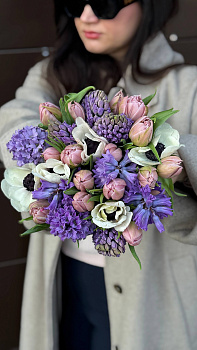 Цей неймовірно свіжий та фактурний букет — справжнє втілення весни. У його складі гармонійно поєднуються контрастні білі анемони з темною серцевиною, пишні суцвіття фіолетових гіацинтів та ніжні рожеві тюльпани. Особливої природності та об'єму композиції додають довгі зелені листи тюльпанів, що створюють ефект садової свіжості. Букет перев'язаний напівпрозорою бузковою стрічкою, яка підкреслює його ніжність. Така яскрава та ароматна композиція стане ідеальним подарунком для коханої дівчини, мами або подруги на день народження, річницю або просто, щоб подарувати гарний настрій. Якщо ви хочете замовити букет, який вражає своєю красою та оригінальним поєднанням квітів, ці свіжі квіти — найкращий вибір. Наша швидка доставка квітів подбає про те, щоб сюрприз був вручений вчасно.