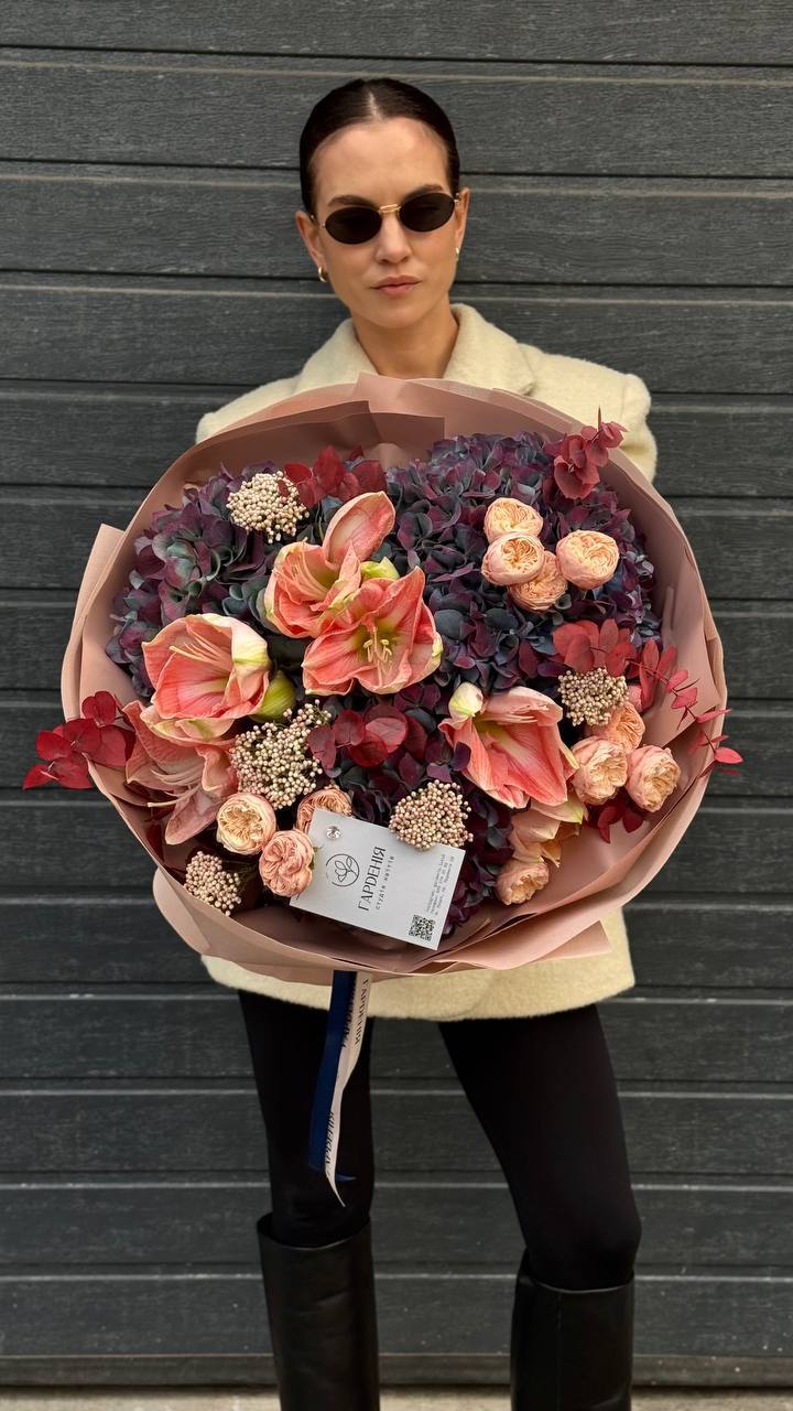 Відкрийте для себе чарівну красу нашої ексклюзивної квіткової композиції з гортензію Pimpernel, амарилісів Darling, троянд Royal Blush, озотамнуса та евкаліпта. Цей букет – розкішне поєднання елегантності та шарму, створене для того, щоб залишити незабутнє враження з будь-якої нагоди. Не пропустіть можливість прикрасити свій день або покращити свій простір цієї чудовою композицією. Замовте зараз і дозвольте магії квітів перетворити будь-яку мить на щось надзвичайне!