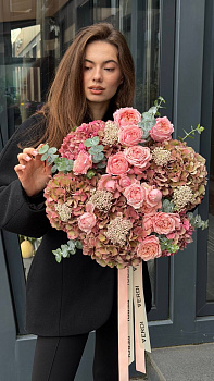 Це розкішне поєднання випромінює шарм та вишуканість, що робить його ідеальним подарунком на будь-яку подію або приголомшливим доповненням до декору вашого дому. Подаруйте радість своїм близьким або побалуйте себе цим надзвичайним букетом.