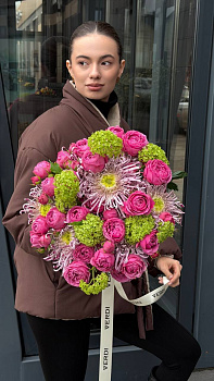 Відкрийте для себе ідеальне поєднання елегантності та шарму з нашим букетом із хризантем Saratov, троянд Misty Bubbles та вібруму. Чи то романтичний жест, сюрприз на день народження, чи подарунок «просто так», цей букет – приголомшливий спосіб висловити свої почуття! Не пропустіть шанс зробити чийсь день справді особливим. Замовте цей захоплюючий букет зараз і дозвольте його красі донести ваше щире послання!