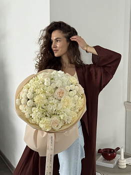Ніжна та витончена композиція, що випромінює чистоту та гармонію. Основу букета складає пишна біла гортензія, доповнена кремовими трояндами сорту Вайт О'Хара та елегантними кулястими хризантемами Сантіні. Багатошарове пакування у бежевих відтінках з фірмовими стрічками підкреслює преміальність та вишуканий стиль подарунка.