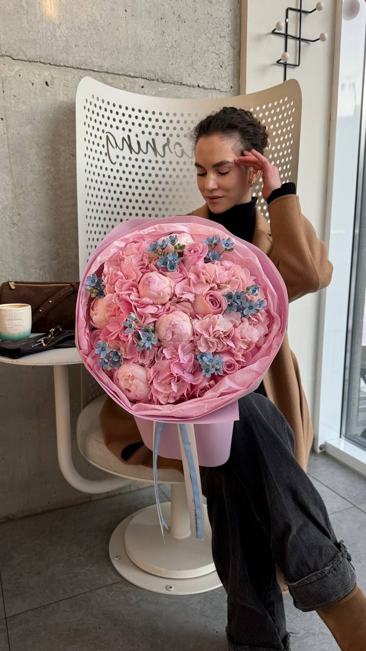 Ніжна та водночас об'ємна композиція, що поєднує в собі затишок і витонченість. До складу входять пишні рожеві півонії, суцвіття гортензії та дрібні блакитні квіти оксипеталуму, які створюють неповторний акцент. Букет оформлений у декілька шарів матового пакування ніжно-рожевого кольору, що підкреслює тендітність бутонів.