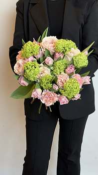 Цей об'ємний та життєствердний букет побудований на вишуканому контрасті ніжних пастельних відтінків та соковитої зелені. Основу композиції складають розкішні піоноподібні троянди персикового кольору та фактурні рожеві гвоздики. Головним акцентом виступають пишні суцвіття салатової вібурнум, які додають букету особливої свіжості та весняного настрою. Доповнюють ансамбль бутони рожевих тюльпанів, що поступово розкриваються, додаючи композиції динаміки.