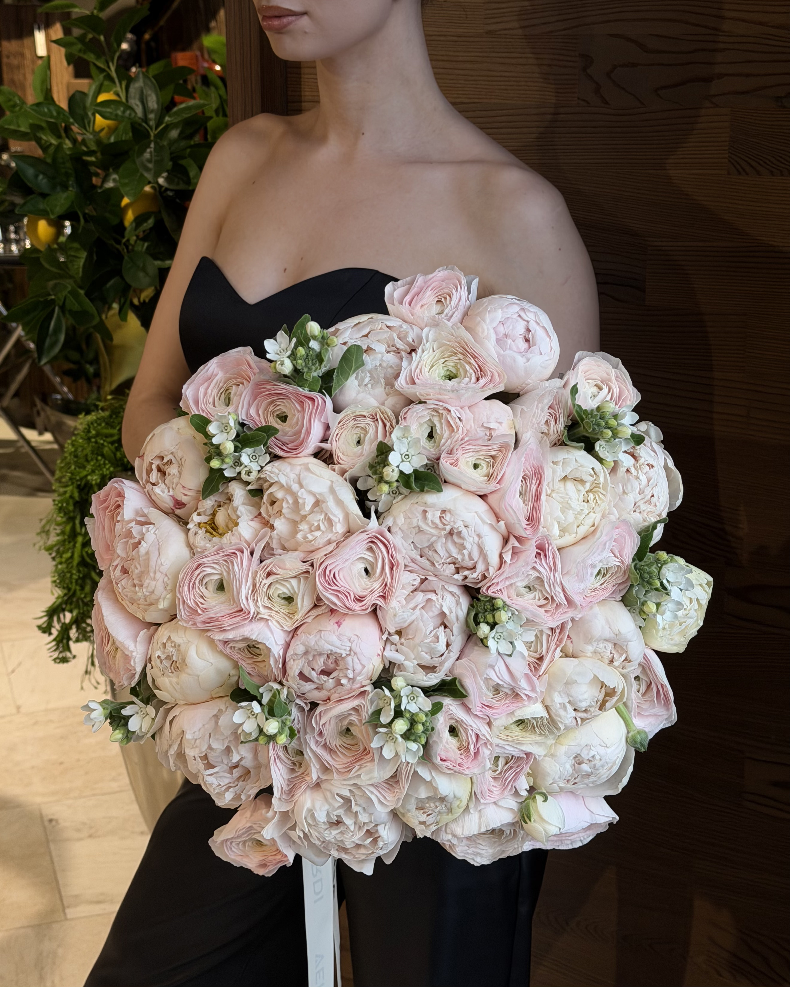 Вишуканий та об'ємний букет, що поєднує в собі преміальні ніжно-рожеві ранункулюси та пишні півонії, доповнені витонченими зірчастими квітками білого оксипеталуму. Композиція має щільну округлу форму та виконана у благородній пастельній гамі. Такий подарунок стане ідеальним вибором для коханої дівчини, дружини або мами на день народження, річницю весілля чи як вишуканий комплімент.