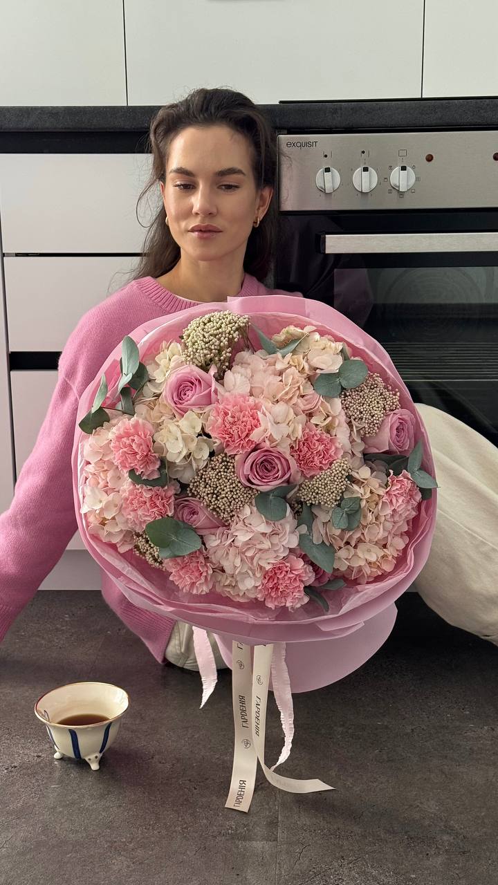 Ніжний та об’ємний букет, що поєднує в собі пишні суцвіття кремової гортензії, класичні рожеві троянди та фактурні гвоздики (діантуси). Особливої витонченості композиції додають гілочки озотамнусу з дрібними суцвіттями та сріблясте листя евкаліпту. Букет оформлений у багатошарове матове пакування рожевого кольору, що підкреслює тендітність квітів та створює сучасний образ.