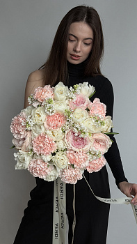 Розкішний та об'ємний букет у вишуканій персиково-рожевій гамі. До складу входять преміальні півонієподібні троянади з відкритим центром, ніжні махрові гвоздики та гілочки запашного білого бузку. Таке поєднання створює неймовірну глибину кольору та багату фактуру, а тонкий аромат бузку додає композиції особливого шарму.