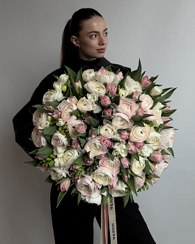 Неймовірно пишний та багатошаровий букет, що вражає своєю об'ємною формою та ніжністю кольорової гами. Основу композиції складають великі кремові ранункулюси з делікатними рожевими акцентами на пелюстках. Їх доповнюють мініатюрні рожеві тюльпани та витончені суцвіття білої фрезії, а гострі зелені листочки тюльпанів створюють ефектний каркас і додають букету природної динаміки.