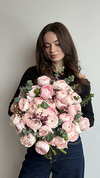 Цей неймовірно ніжний та вишуканий букет створений для тих, хто цінує досконалість у деталях. Основу композиції складають розкішні світло-рожеві ранункулюси, чиї багатошарові пелюстки нагадують тендітні хмаринки. Свіжість та легкий аромат букету додають гілочки сизого евкаліпту, а дрібні квіти хамелаціуму створюють цікаві акценти, роблячи форму композиції об'ємною та повітряною.
