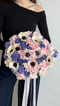 Цей контрастний та фактурний букет — справжнє втілення весняної свіжості. У центрі композиції знаходяться вишукані білі анемони з виразними темними серединками, що гармонійно поєднуються з насиченими суцвіттями фіолетових гіацинтів. Ніжно-рожеві та персикові гвоздики додають букету пишності та м’якості, створюючи ідеальний баланс кольорів. Композиція доповнена довгими атласними стрічками, які підкреслюють її елегантність.