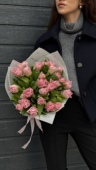 Цей неймовірно ніжний букет складається зі свіжих півонієподібних тюльпанів витонченого рожевого кольору. Завдяки великій кількості пелюсток бутони виглядають об'ємними та нагадують півонії, що надає композиції особливої розкоші. Букет оформлений у світле фірмове пакування, яке підкреслює тендітність весняних квітів. Це ідеальний вибір, щоб привітати маму, сестру або кохану дівчину з днем народження чи святом весни. Якщо ви хочете замовити букет, який випромінює свіжість та ніжність, цей варіант буде бездоганним. Наша професійна доставка квітів допоможе вам купити квіти та подарувати святковий настрій близькій людині.