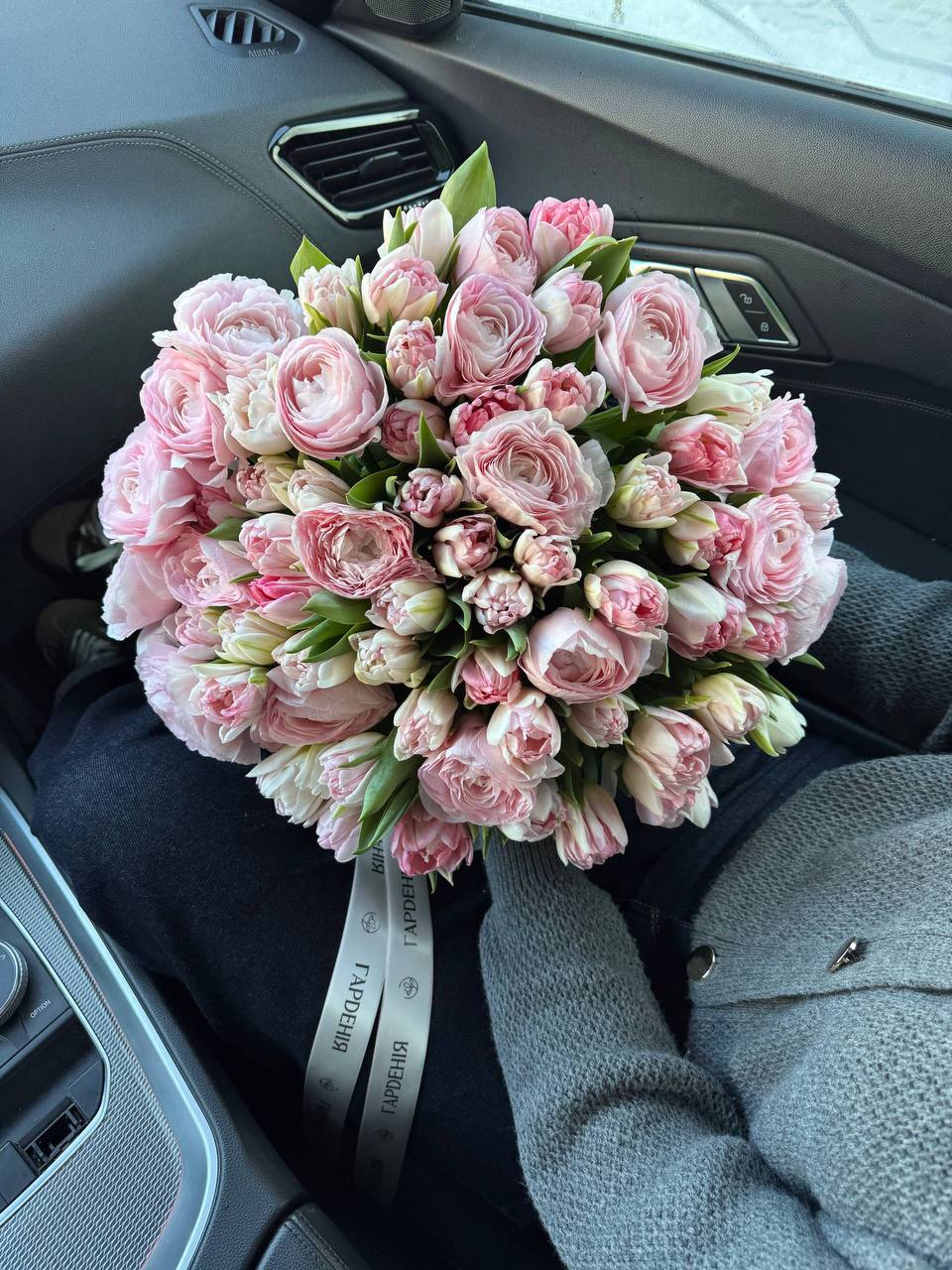 Цей розкішний та неймовірно пишний букет зібраний зі свіжих квітів найніжніших відтінків: сортових півонієподібних тюльпанів та витончених ранункулюсів. Композиція вражає своєю багатошаровістю та об'ємом, створюючи справжній ефект "квіткової хмари". Такий подарунок ідеально підійде для коханої дівчини, дружини або мами на день народження, річницю чи як особливий знак уваги. Якщо ви бажаєте замовити букет, який гарантовано подарує весняний настрій та щирі емоції, цей варіант буде найкращим вибором. Наша професійна доставка квітів подбає про те, щоб ви могли купити квіти найвищої якості та порадувати близьких у важливий момент.