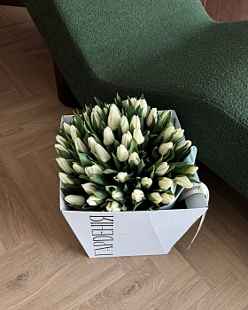 Ця елегантна та лаконічна композиція складається з великої кількості свіжих білих тюльпанів, щільно викладених у стильну білу коробку. Чистий білий колір бутонів у поєднанні з соковитою зеленню листя створює відчуття свіжості, весни та благородства. Такий формат подарунка дуже практичний, адже квіти вже знаходяться у спеціальному середовищі й не потребують вази. Композиція ідеально підійде для привітання колеги, бізнес-партнера або як витончений презент для мами чи коханої дівчини. Якщо ви шукаєте стильний та сучасний подарунок, варто замовити букет у коробці, який стане прикрасою будь-якого інтер'єру. Наші свіжі квіти завжди дарують щирі емоції, а швидка доставка квітів забезпечить бездоганний сервіс до ваших дверей.
