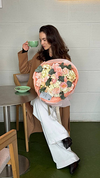 Цей розкішний та об'ємний букет поєднує в собі витончені персикові троянди, пухнасті кремові гвоздики та свіжі білі суцвіття, доповнені благородними гілочками евкаліпту. Композиція оформлена у багатошарове пакування ніжно-персикового відтінку, що ідеально підкреслює теплу гаму квітів. Такий подарунок чудово підійде для мами, коханої дівчини або колеги на день народження, річницю чи як особливий знак уваги. Якщо ви бажаєте замовити букет, який випромінює гармонію та затишок, цей варіант стане найкращим вибором. Наші завжди свіжі квіти гарантовано подарують радість, а швидка доставка квітів допоможе привітати близьких вчасно.