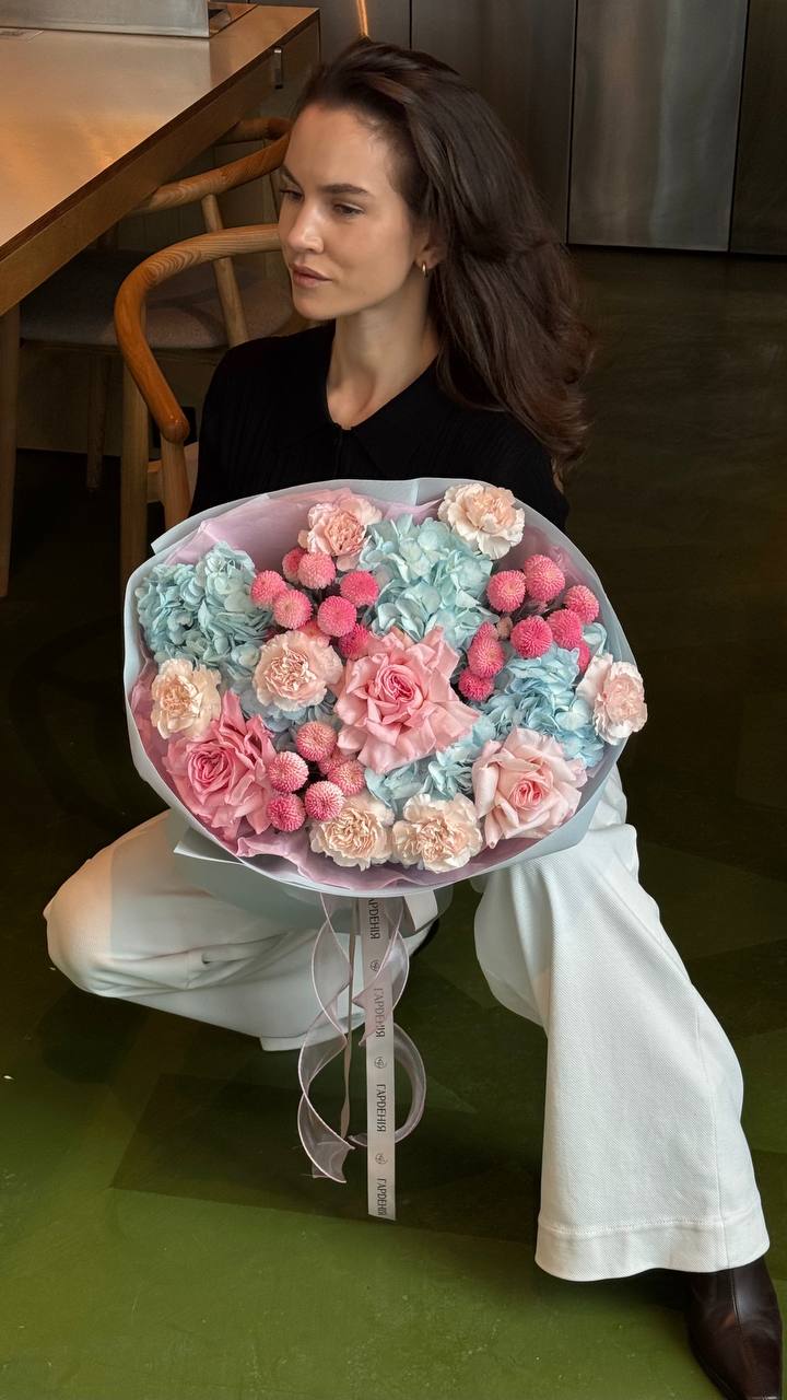 Ця яскрава та водночас ніжна композиція вражає контрастним поєднанням небесно-блакитної гортензії, насичено-рожевих троянд та делікатних кремово-рожевих гвоздик. Особливого шарму букету додають грайливі рожеві кульки краспедії, що роблять форму фактурною та сучасною. Букет оформлений у лаконічне світле пакування, яке не відволікає уваги від краси самих квітів. Такий подарунок стане ідеальним вибором для дівчини, сестри або близької подруги на день народження чи для особливого весняного настрою. Якщо ви плануєте купити квіти, які запам'ятаються своєю оригінальністю, цей варіант підійде ідеально. Наша доставка квітів працює оперативно, щоб ви могли замовити букет і отримати свіжі квіти точно вчасно.