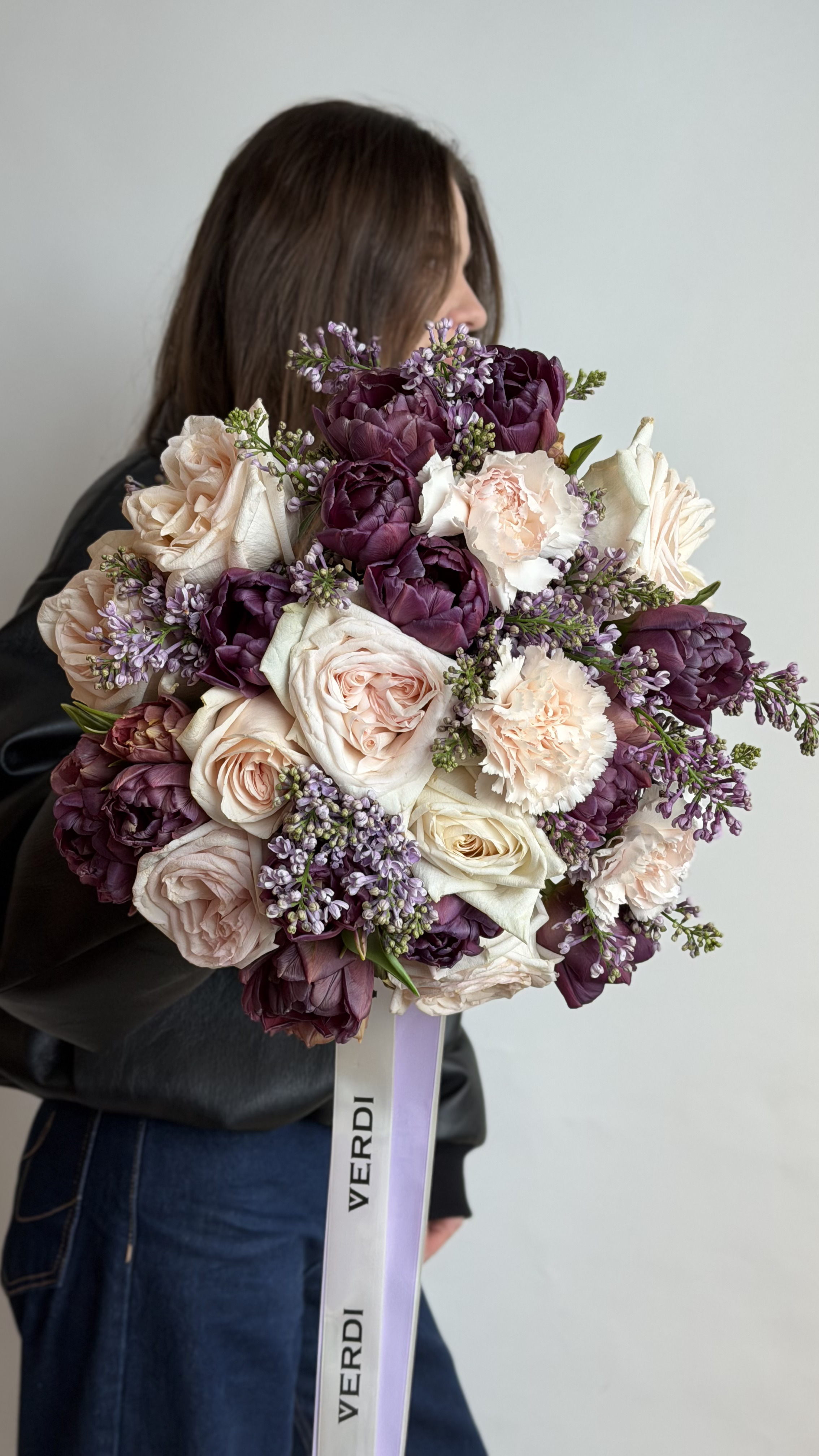 Ця драматична та вишукана композиція побудована на глибокому контрасті світлих та темних відтінків. Великі піоноподібні троянди ніжного кремового кольору та витончені гвоздики ідеально поєднуються з насиченими пурпуровими тюльпанами. Особливого весняного шарму та аромату букету додають гілочки свіжого фіолетового бузку. Таке поєднання виглядає по-королівськи благородно і стане чудовим подарунком для коханої жінки, мами або бізнес-партнера на ювілей чи іншу важливу подію. Якщо ви хочете замовити букет, який вразить своєю естетикою та глибиною, ця композиція — ідеальний вибір. Наша доставка квітів працює, щоб ви могли дарувати тільки найсвіжіші квіти та незабутні емоції.