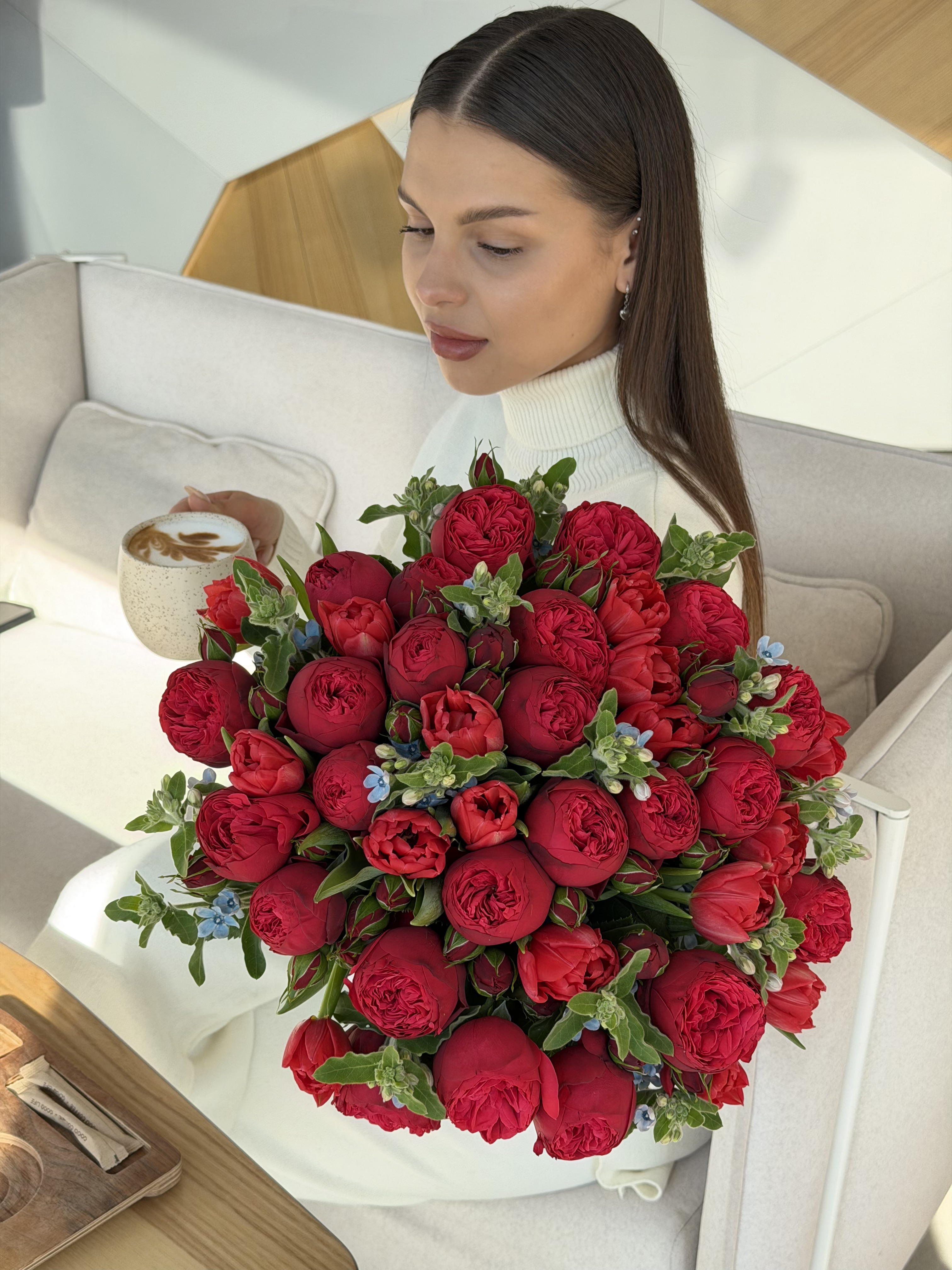 Цей розкішний та пристрасний букет зібраний з відбірних червоних піоноподібних троянд і витончених тюльпанів у тон. Особливого шарму та тендітності композиції додають дрібні блакитні квіти оксипеталуму, які створюють стильний кольоровий акцент. Такий ансамбль ідеально підійде для коханої дівчини, дружини або як особливий комплімент на день народження чи річницю. Якщо ви бажаєте купити квіти, які гарантовано подарують незабутні емоції, цей букет стане найкращим вибором. Наші свіжі квіти довго милуватимуть око, а швидка доставка квітів дозволить зробити сюрприз максимально неочікуним та приємним.