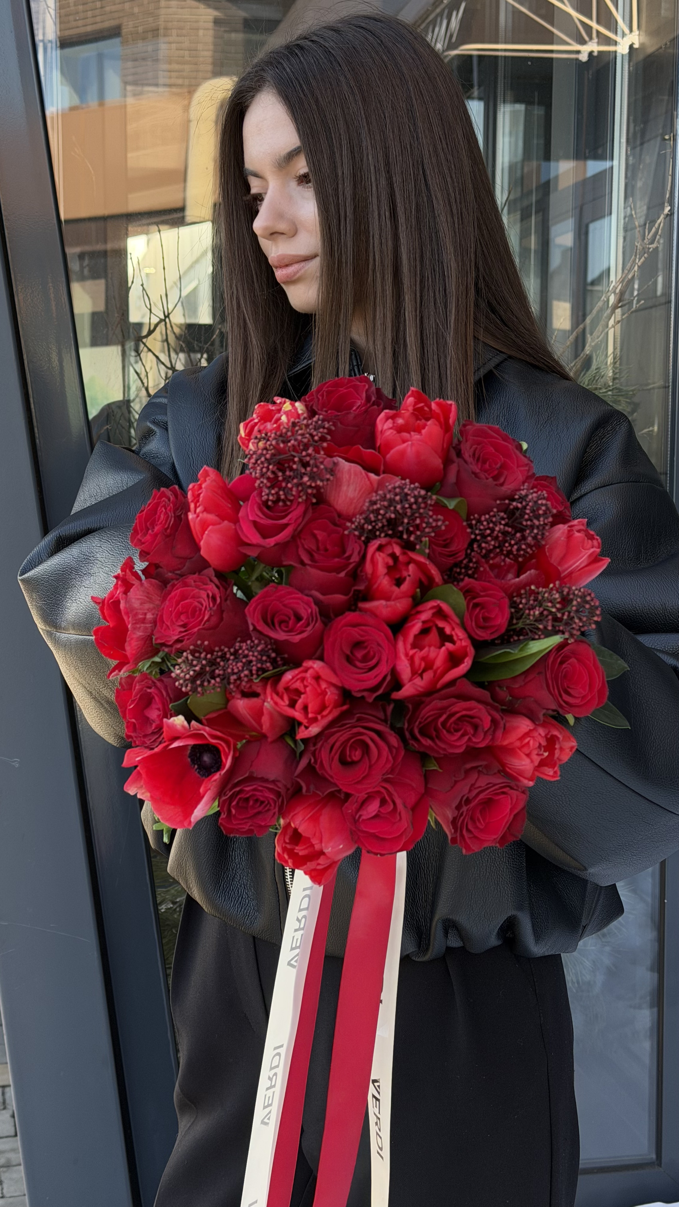 Цей пристрасний та багатогранний букет у вогняно-червоних відтінках є справжнім втіленням елегантності. Композиція поєднує в собі класичні червоні троянди, витончені тюльпани та акцентну анемону, а фактурна скімія додає ансамблю особливого стилю. Такий розкішний подарунок ідеально підійде для коханої жінки на річницю, День святого Валентина або як особливий сюрприз на день народження. Якщо ви плануєте купити квіти, які скажуть про ваші почуття без слів, цей букет — бездоганний вибір. Наші свіжі квіти завжди виглядають неперевершено, а надійна доставка квітів допоможе вам зробити цей момент незабутнім.