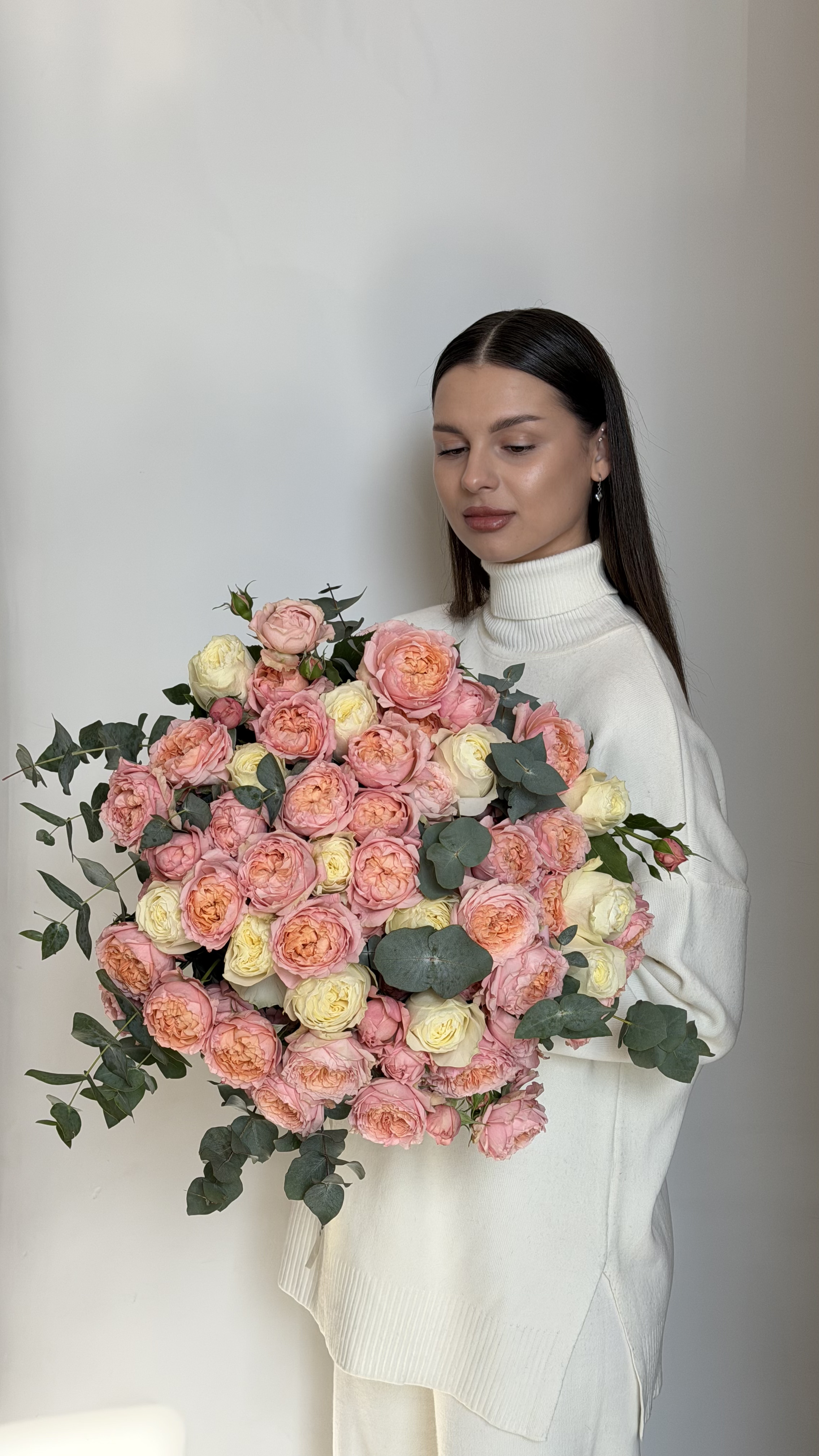 Цей розкішний та об'ємний букет створений із поєднання преміальних квітів: пишних персикових піоновидних троянд, ніжних жовтих троянд та ароматних гілочок евкаліпту. Композиція виконана у вільному природному стилі, що дозволяє повноцінно розкритися кожному бутону. Такий вишуканий подарунок у теплих пастельних тонах ідеально підійде для особливого випадку — ювілею, дня народження коханої дівчини або як ніжний сюрприз для мами. Якщо ви хочете замовити букет, який вражає своєю естетикою та об'ємом, ці свіжі квіти стануть найкращим вибором. Наша професійна доставка квітів допоможе вам подарувати радість близьким людям у будь-який момент.