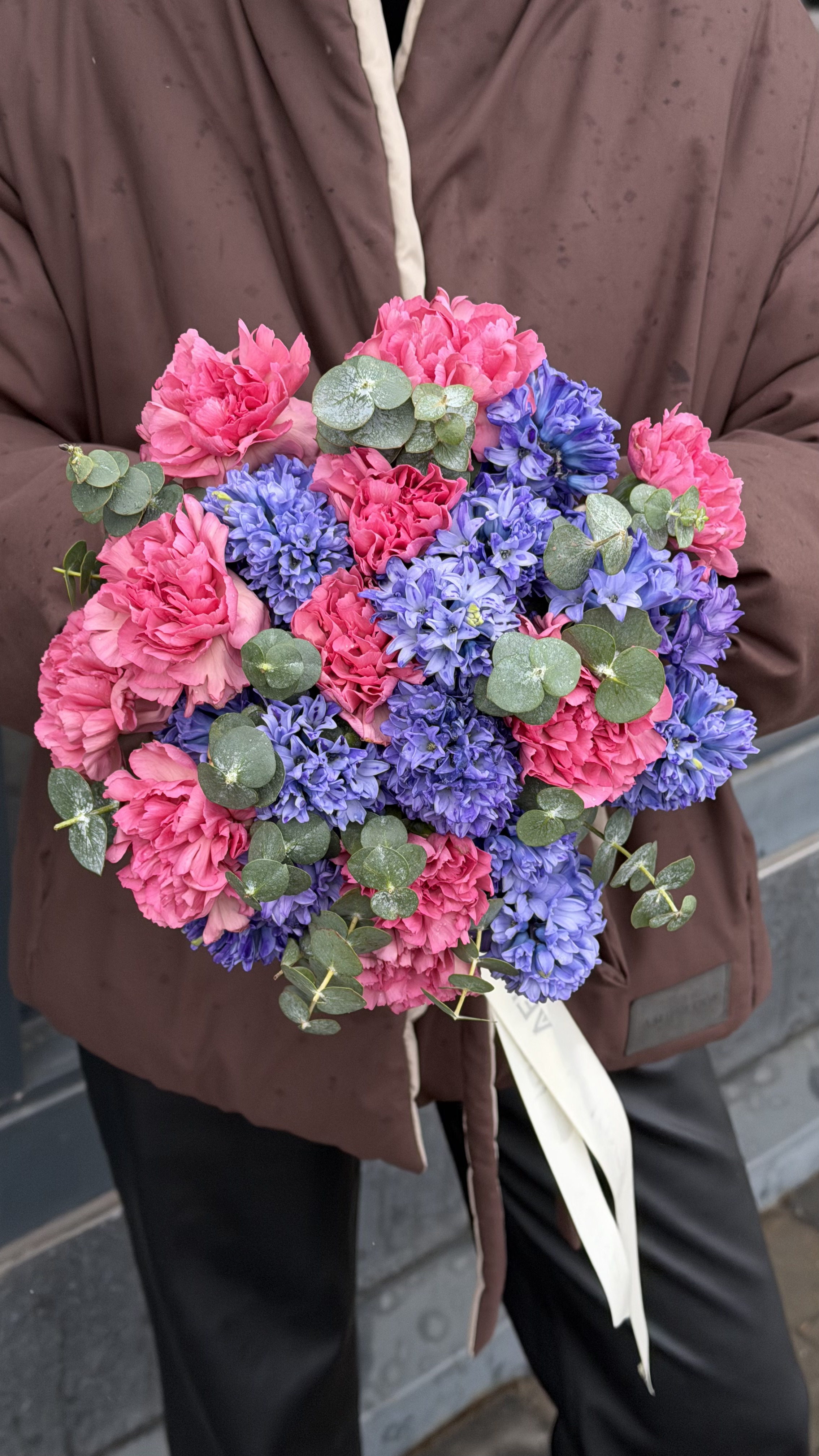 Цей яскравий та текстурний букет поєднує в собі насичені рожеві гвоздики та глибокі фіолетові гіацинти, доповнені свіжими гілочками евкаліпту. Композиція виглядає об'ємною та стильною завдяки контрастному поєднанню кольорів та природній формі без зайвого пакування. Такий подарунок ідеально підійде для мами, сестри або близької подруги на день народження, річницю або просто як знак уваги. Якщо ви бажаєте купити квіти, які запам'ятаються своїм ароматом та вишуканістю, цей букет — чудовий вибір. Наша професійна доставка квітів гарантує, що ви отримаєте виключно свіжі квіти точно вчасно. Ви можете замовити букет прямо зараз, щоб подарувати весняний настрій у будь-яку пору року.