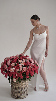 Ця розкішна величезна корзина наповнена відбірними кущовими трояндами насиченого малинового та делікатного рожевого відтінків. Пишні бутони піоноподібної форми створюють неймовірний об'єм та виглядають надзвичайно ефектно у плетеному кошику натурального кольору. Такий грандіозний подарунок створений для особливих подій: ювілею, заручин, весілля або щоб висловити найглибші почуття коханій жінці. Якщо ви шукаєте спосіб по-справжньому вразити, варто замовити букет такого масштабу. Наші свіжі квіти довго радуватимуть одержувача своєю красою та тонким ароматом. Швидка доставка квітів допоможе організувати незабутній сюрприз та вручити цей шедевр флористики особисто в руки.