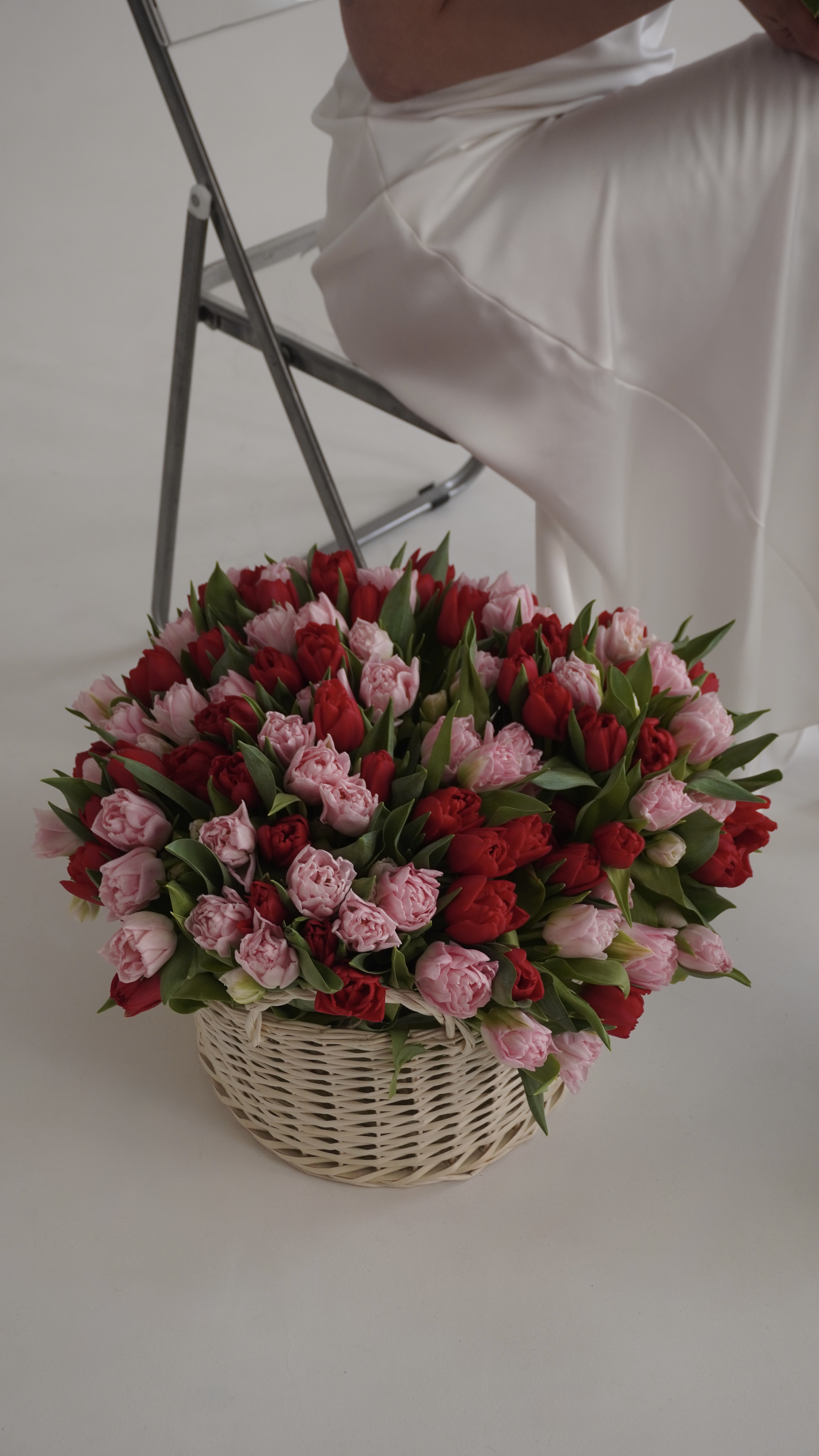 Ця пишна корзина — справжнє свято весни та краси. Композиція складається з великої кількості махрових піоноподібних тюльпанів двох контрастних кольорів: ніжно-рожевого та насиченого червоного. Щільне розташування бутонів створює ефект квітучої хмари, а свіже зелене листя додає букету природної соковитості. Світла плетена корзина гармонійно доповнює яскраві квіти, роблячи цей подарунок не лише розкішним, а й практичним у догляді. Такий об’ємний та життєрадісний презент ідеально підійде для привітання з особливою датою, ювілеєм або як знак щирої вдячності та любові. Якщо ви хочете замовити букет, який вражає своєю масштабністю та свіжістю, ці квіти стануть вашим найкращим вибором. Наша доставка квітів працює, щоб ваші найщиріші побажання були почуті та побачені в найгарнішій формі.