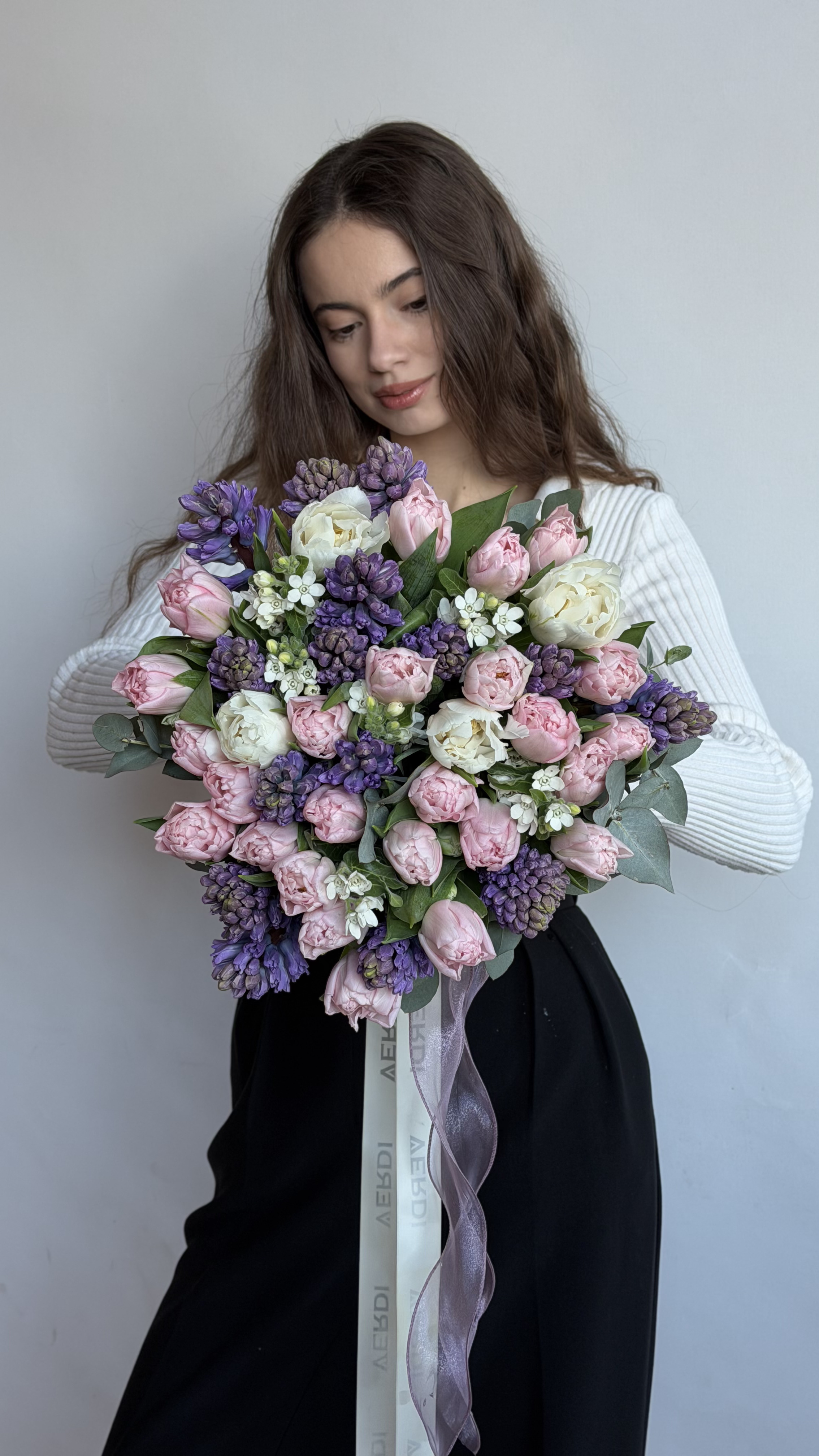 Цей розкішний весняний букет поєднує в собі ніжність рожевих піоноподібних тюльпанів, глибокий колір ароматних фіолетових гіацинтів та витончені суцвіття білого оксипеталуму. Доповнена гілочками евкаліпту та дрібним хамелаціумом, композиція виглядає об’ємною та максимально природною. Такий букет стане ідеальним подарунком для коханої дівчини, дружини або мами на день народження, 8 березня чи як романтичний сюрприз. Якщо ви бажаєте замовити букет, що випромінює свіжість та справжній весняний настрій, ця позиція — найкращий вибір. Наші свіжі квіти гарантовано подарують радість, а швидка доставка квітів допоможе привітати близьких вчасно.