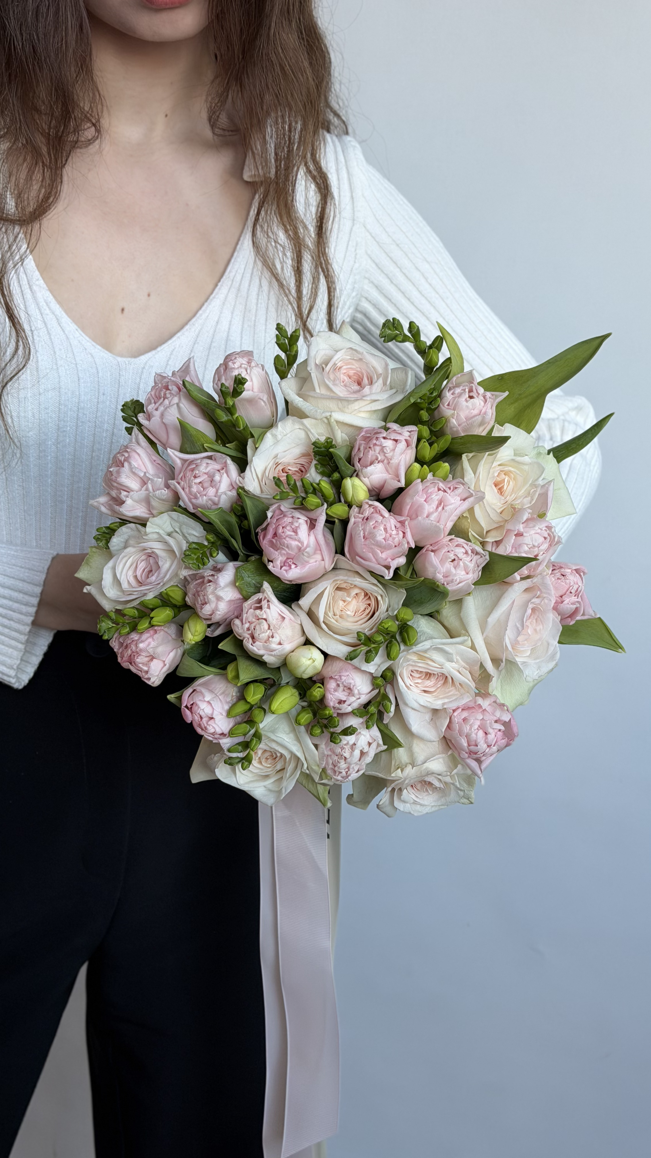 Цей вишуканий букет випромінює ніжність та весняну легкість завдяки поєднанню пишних рожевих тюльпанів та елегантних кремових троянд. Особливого шарму композиції додають яскраві бутони зеленої фрезії, які роблять букет живим та фактурним. Така тендітна палітра кольорів робить його ідеальним вибором для подарунка дівчині на побачення, мамі на день народження або колезі як знак вдячності. Якщо ви плануєте замовити букет, який вразить своєю витонченістю, цей варіант підійде якнайкраще. Наші завжди свіжі квіти гарантують тривалу радість, а професійна доставка квітів допоможе вчасно передати ваші найтепліші побажання.