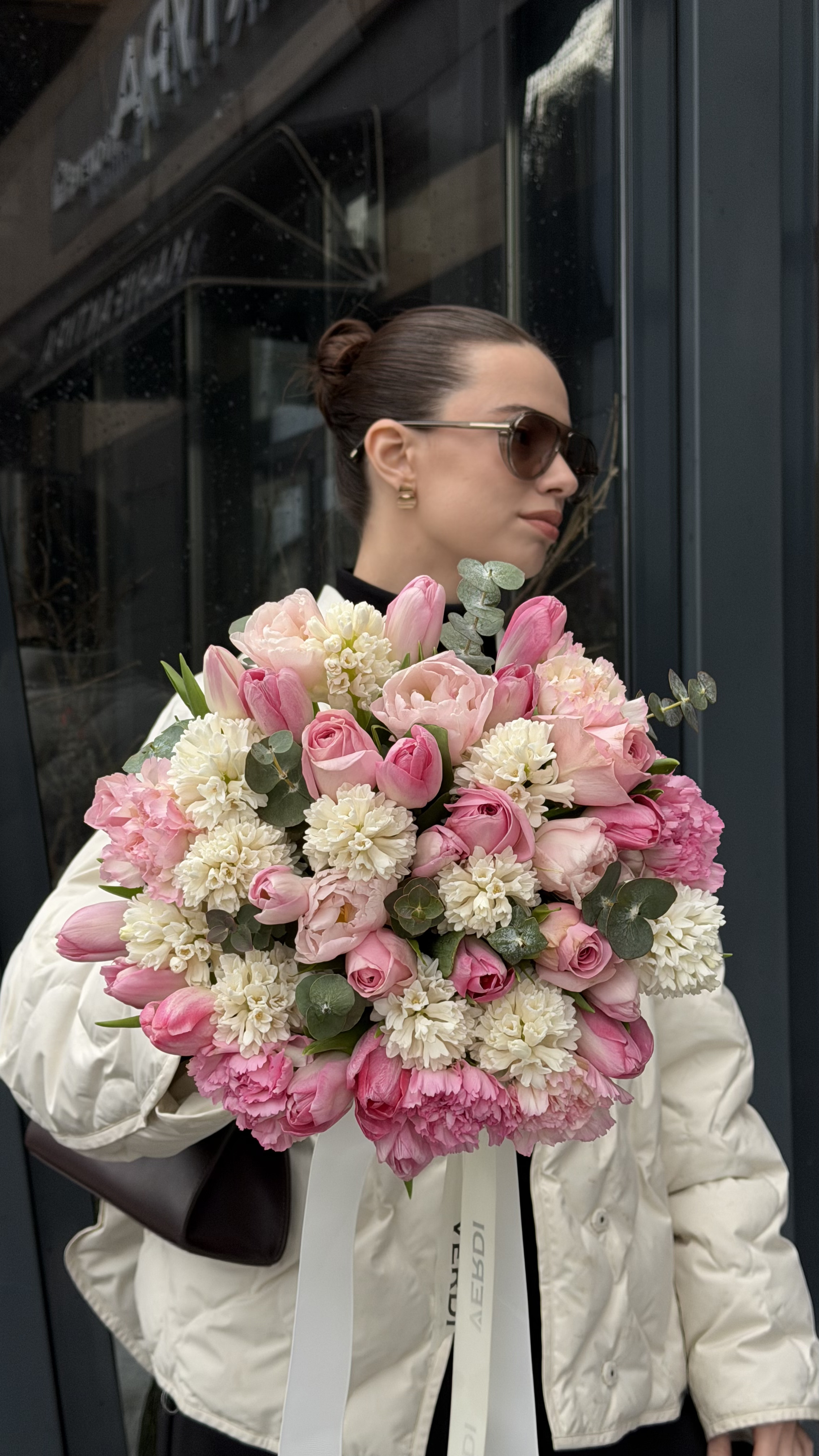 Цей розкішний та об'ємний букет поєднує в собі ніжність рожевих тюльпанів, вишуканість троянд та текстурні суцвіття білих гіацинтів. Акценти з гілочок евкаліпту додають композиції свіжості та особливого аромату, а елегантна біла стрічка завершує стильний образ. Така пишна композиція стане ідеальним подарунком для коханої дівчини, мами або колеги на день народження, річницю чи як вишуканий жест уваги. Якщо ви бажаєте купити квіти, які гарантовано подарують весняний настрій, цей букет — найкращий вибір. Наша професійна доставка квітів подбає про те, щоб ви могли замовити букет і отримати виключно свіжі квіти точно вчасно.