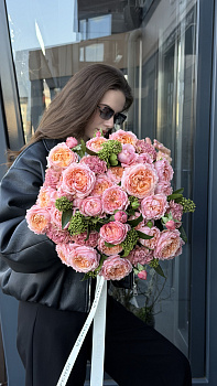 Цей розкішний і неймовірно пишний букет складається з преміальних піоноподібних троянд насиченого рожевого та персикового відтінків. Особливої текстурності композиції додають суцвіття екзотичної калини (вібурнуму) та густа зелень, що створюють ефектний контраст. Таке елегантне поєднання підійде як для особливого випадку — ювілею чи пропозиції руки і серця, так і як вишуканий подарунок для коханої дівчини або мами. Якщо ви шукаєте спосіб вразити близьку людину, ми радимо купити квіти саме такого формату. Ці свіжі квіти стануть головною прикрасою свята, а наша доставка квітів допоможе організувати незабутній сюрприз у потрібний момент.