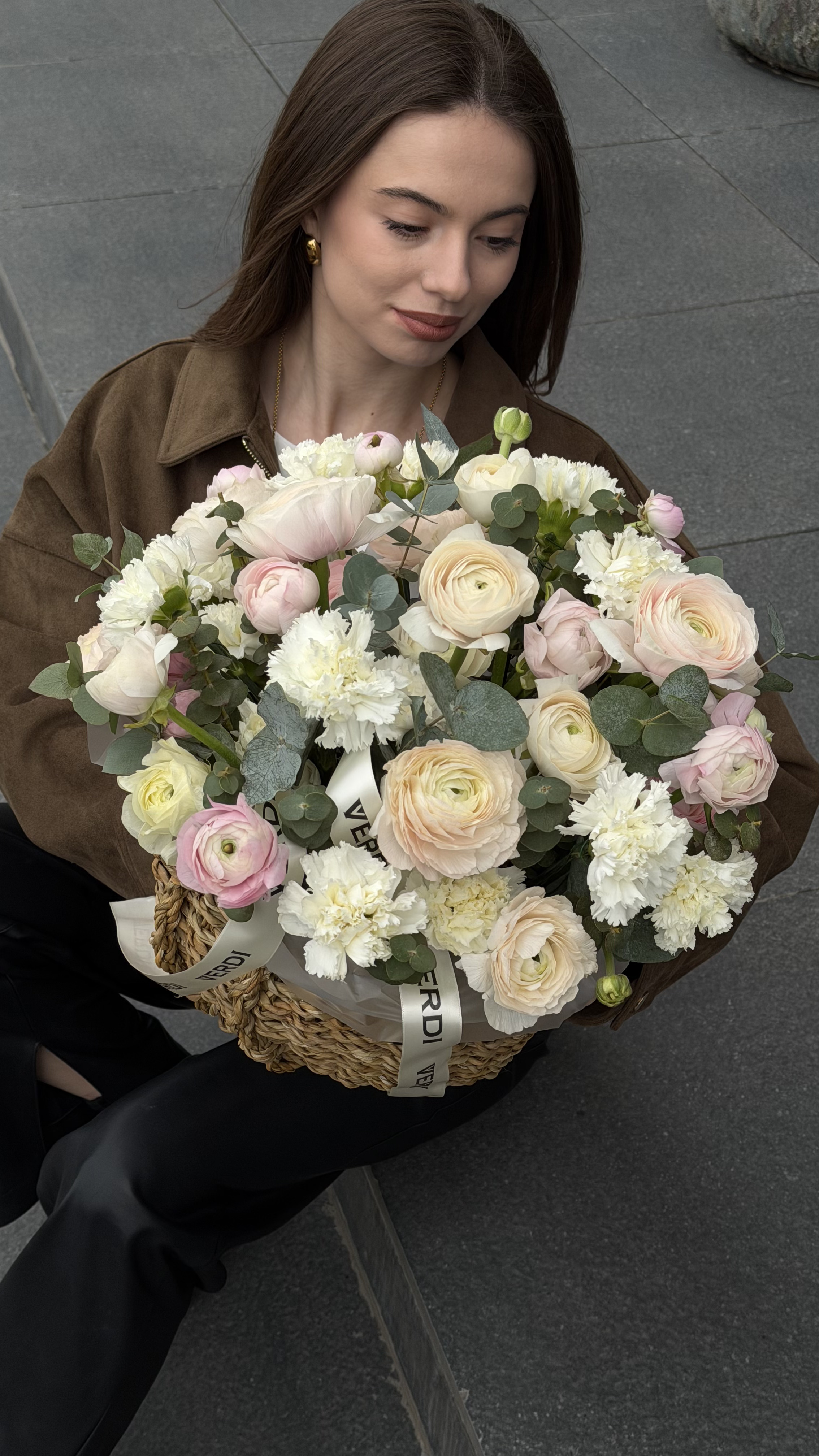 Ця пишна та ніжна композиція у стильному плетеному кошику виглядає неймовірно затишно та вишукано. У складі букета поєднуються об'ємні кремові та пудрові ранункулюси, фактурні білі гвоздики та витончені гілочки сріблястого евкаліпту. Світла кольорова гама та натуральні матеріали пакування роблять цей кошик ідеальним подарунком для мами на день народження, для коханої дівчини на річницю або як елегантне привітання колеги. Це чудовий спосіб висловити турботу та найщиріші почуття. Якщо ви хочете замовити букет, який вразить своєю свіжістю та нестандартною подачею, цей варіант ідеальний. Наші завжди свіжі квіти подарують радість одержувачу, а швидка доставка квітів допоможе вам зробити сюрприз вчасно. Достатньо лише купити квіти, і ми подбаємо про ідеальне виконання вашого замовлення.
