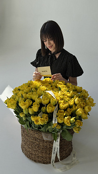 Ця розкішна композиція складається з величезної кількості яскраво-жовтих півонієподібних тюльпанів, розміщених у стильній плетеній корзині. Пишні багатошарові бутони створюють вражаючий об'єм, а декоративні фірмові стрічки додають подарунку особливого статусу та елегантності. Така сонячна корзина стане незабутнім сюрпризом для мами, дружини або колеги на ювілей, день народження чи особливе родинне свято. Якщо ви шукаєте спосіб висловити щире захоплення, варто замовити букет у такому форматі — він гарантовано подарує святковий настрій. Наші свіжі квіти довго зберігатимуть свою красу, а професійна доставка квітів забезпечить вчасне вручення цього грандіозного подарунка.