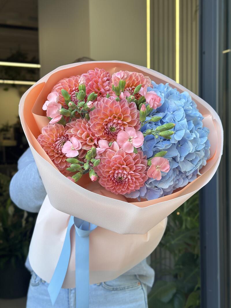 Цей витончений букет поєднує гортензію ВЕРЕНА БЛЮ, 90 см, гвоздику СОЛОМІО РОЗЕ, жоржини та політи МАТ. Текстурна калька і атласна стрічка додають вишуканості композиції.