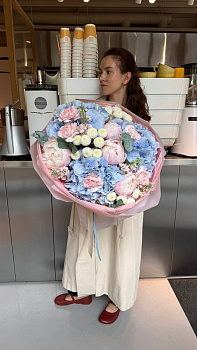 Поєднання гортензій, півоній, матіоли та евкаліпту - хмаринка радощів та ніжностей! Для зручності та захисту квітів під час доставки використовуємо коробку для транспортування, також додаємо підживку для довшого зберігання букету. Доставка по Луцьку та області.