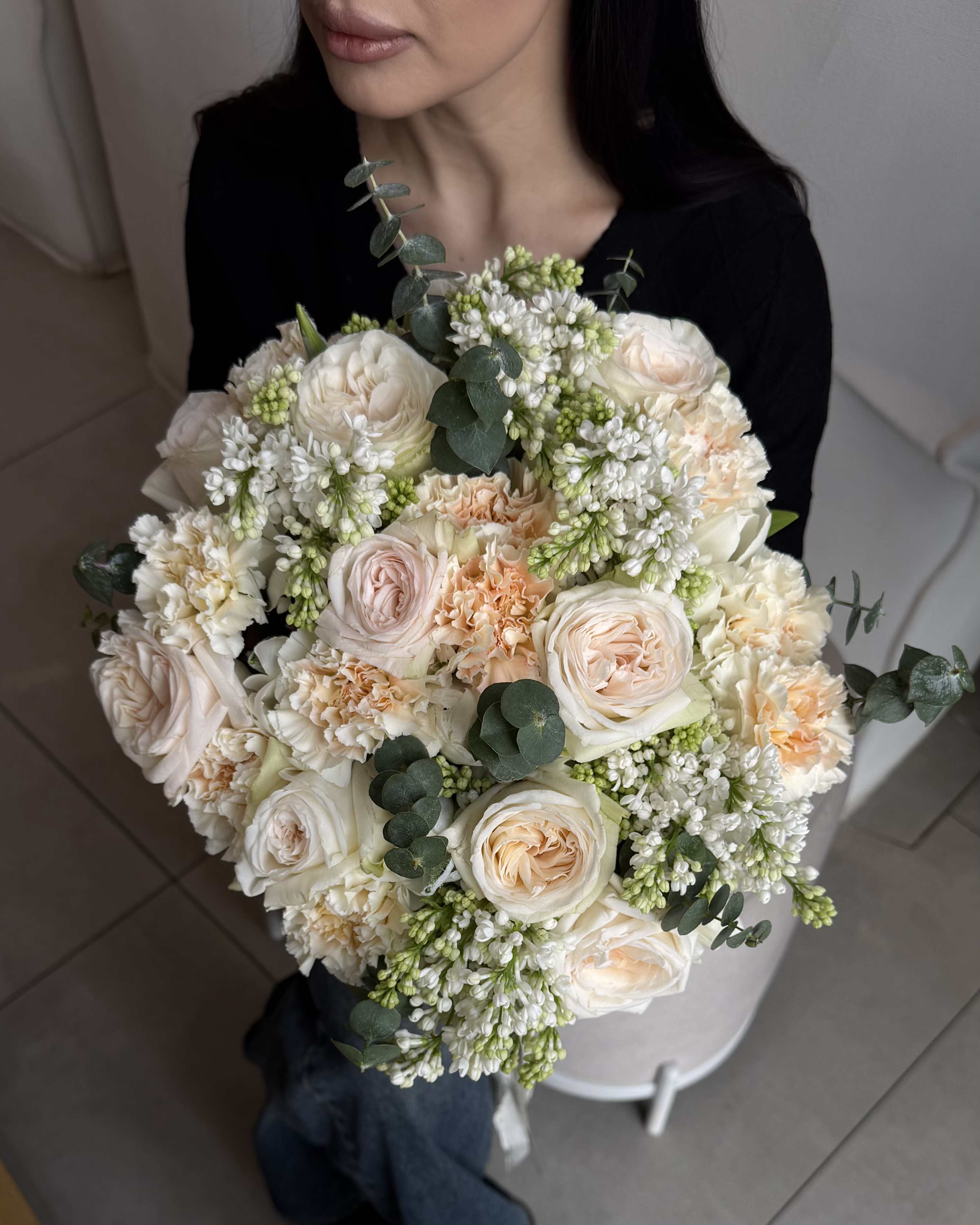 Ніжний та неймовірно пишний букет, що поєднує в собі весняну свіжість та класичну елегантність. До складу композиції входять розкішні кремово-рожеві піоновидні троянди, густі суцвіття білого бузку та вишукані персикові гвоздики. Особливої легкості та природного шарму додають гілочки сизого евкаліпту, а довгі текстильні стрічки пастельних відтінків завершують цей витончений образ. Така об'ємна та ароматна композиція стане ідеальним подарунком для коханої дівчини, мами або колеги на день народження, весілля чи просто для гарного настрою. Якщо ви хочете замовити букет, який випромінює світло та ніжність, цей варіант підійде якнайкраще. Ми пропонуємо лише свіжі квіти, які будуть радувати своєю красою довгий час. Наша швидка доставка квітів дозволить вам купити квіти та зробити приємний сюрприз близькій людині у найважливіший момент.