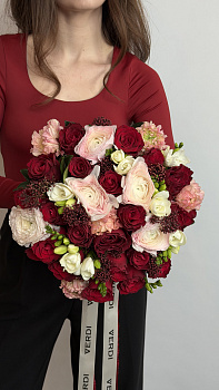 Вишуканий букет округлої форми, що поєднує в собі ніжність рожевих ранункулюсів, пристрасть насичено-червоних троянд та витонченість білої фрезії. Композиція доповнена фактурною скімією та декоративною зеленню, що надає їй особливої густини та об'єму. Стебла перев'язані стильними фірмовими стрічками, що підкреслює елегантність подарунка без зайвого пакування.