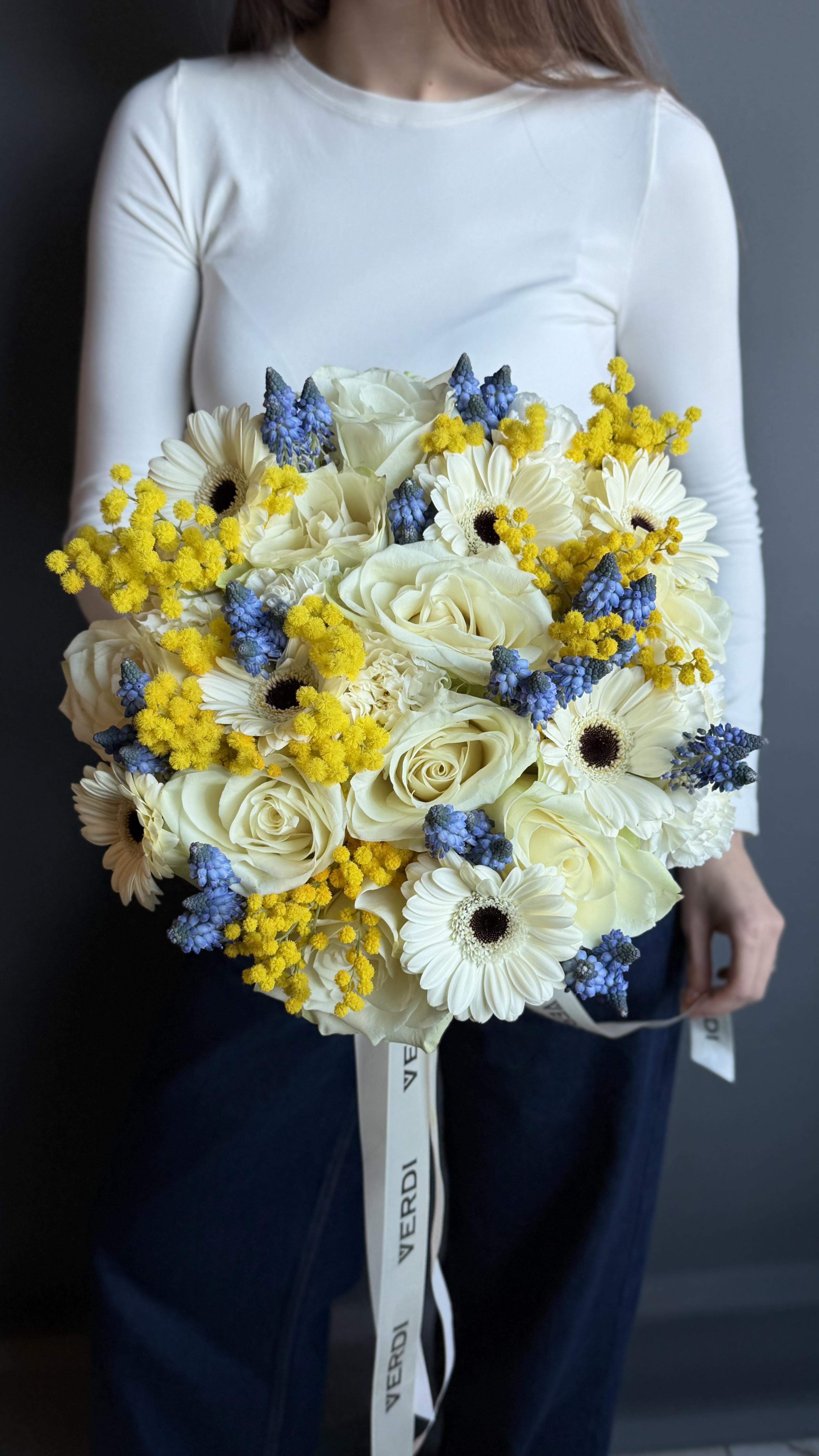 Яскравий та водночас ніжний букет, що поєднує в собі класичну красу білих троянд і витончених гербер з контрастними акцентами жовтої мімози та блакитних мускарі. Ця сонячна композиція доповнена пишними білими гвоздиками, що створюють щільну та фактурну форму. Квіти зібрані під фірмову стрічку, що підкреслює їхню природну красу та свіжість.
