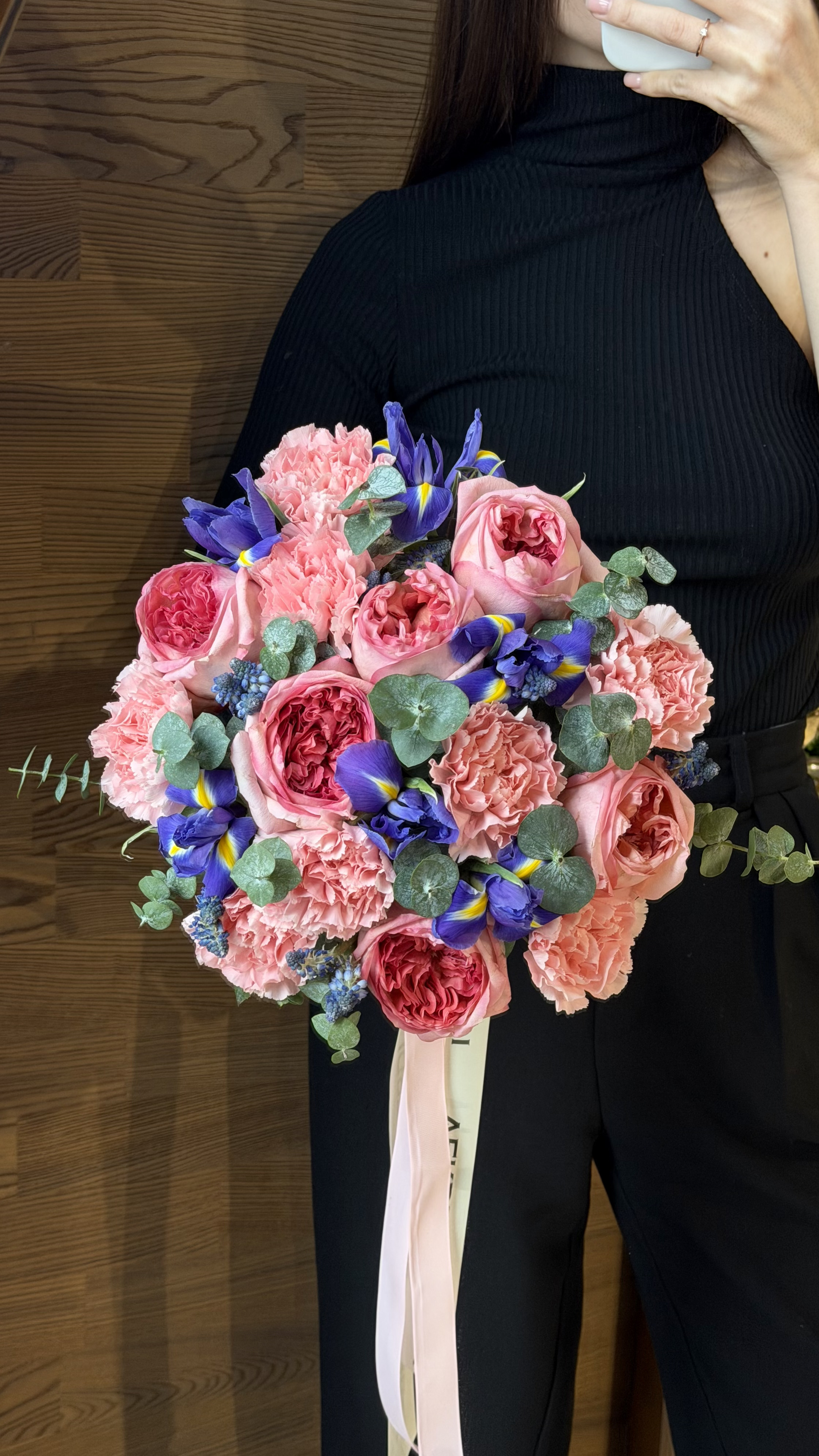 Вишуканий круглий букет, що поєднує в собі розкішні рожеві півонієподібні троянди, ніжні рожеві гвоздики та контрастні сині іриси. Композиція доповнена блакитними суцвіттями мускарі та сріблястими гілочками евкаліпту, що додають легкого аромату та фактурності. Букет перев’язаний атласними стрічками, які підкреслюють його елегантність.