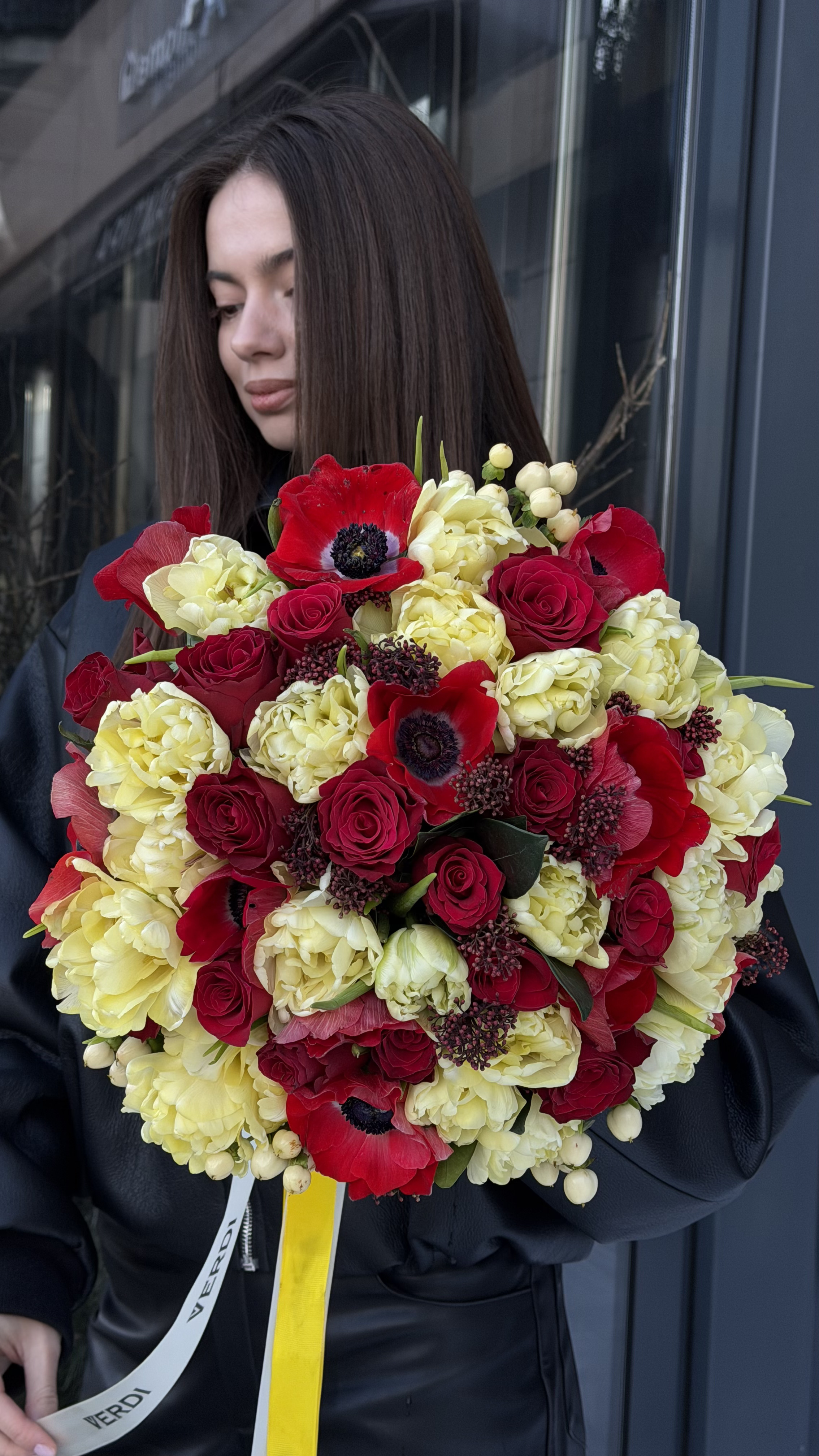 Цей яскравий та енергійний букет вражає своєю насиченою палітрою та багатством фактур. У центрі композиції — палкі червоні анемони з виразними темними серединками та класичні червоні троянди, що символізують глибокі почуття. Сонячні акценти створюють пишні жовті піоноподібні тюльпани, а дрібні суцвіття червоної скімії та білі ягоди гіперікуму додають букету особливого стилю та об'єму. Така масштабна та життєрадісна композиція стане чудовим подарунком для коханої жінки, мами або близької людини на день народження, ювілей чи іншу значущу подію. Якщо ви хочете замовити букет, який випромінює тепло та святковий настрій, ці свіжі квіти будуть ідеальним вибором. Наша доставка квітів подбає про те, щоб цей розкішний подарунок приніс щиру радість вашим близьким.