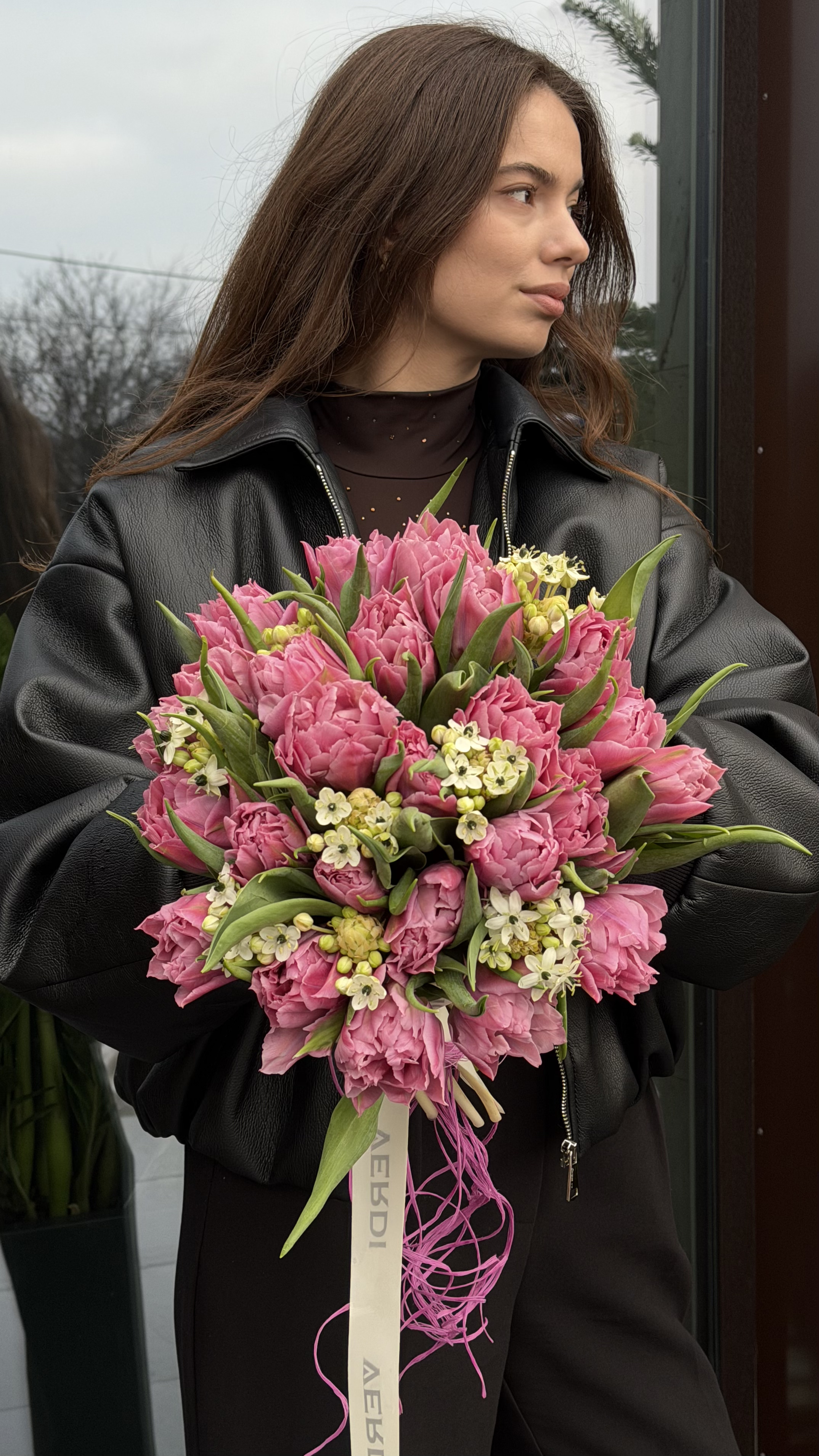 Цей розкішний та фактурний букет зібраний з густомахрових півонієподібних тюльпанів насиченого рожевого відтінку та витончених суцвіть білого орнітогалуму. Композиція доповнена натуральною зеленню та перев'язана фірмовими стрічками, що підкреслює її природну красу та преміальний стиль. Такий об'ємний та стійкий букет стане ідеальним подарунком для коханої дівчини, дружини або мами на день народження, річницю чи як особливий знак уваги. Якщо ви шукаєте свіжі квіти з незвичним поєднанням сортів, цей варіант задовольнить найвибагливіший смак. Наша швидка доставка квітів гарантує, що одержувач отримає подарунок у найкращому вигляді. Ви можете замовити букет прямо зараз, щоб подарувати весняний настрій та щирі емоції.