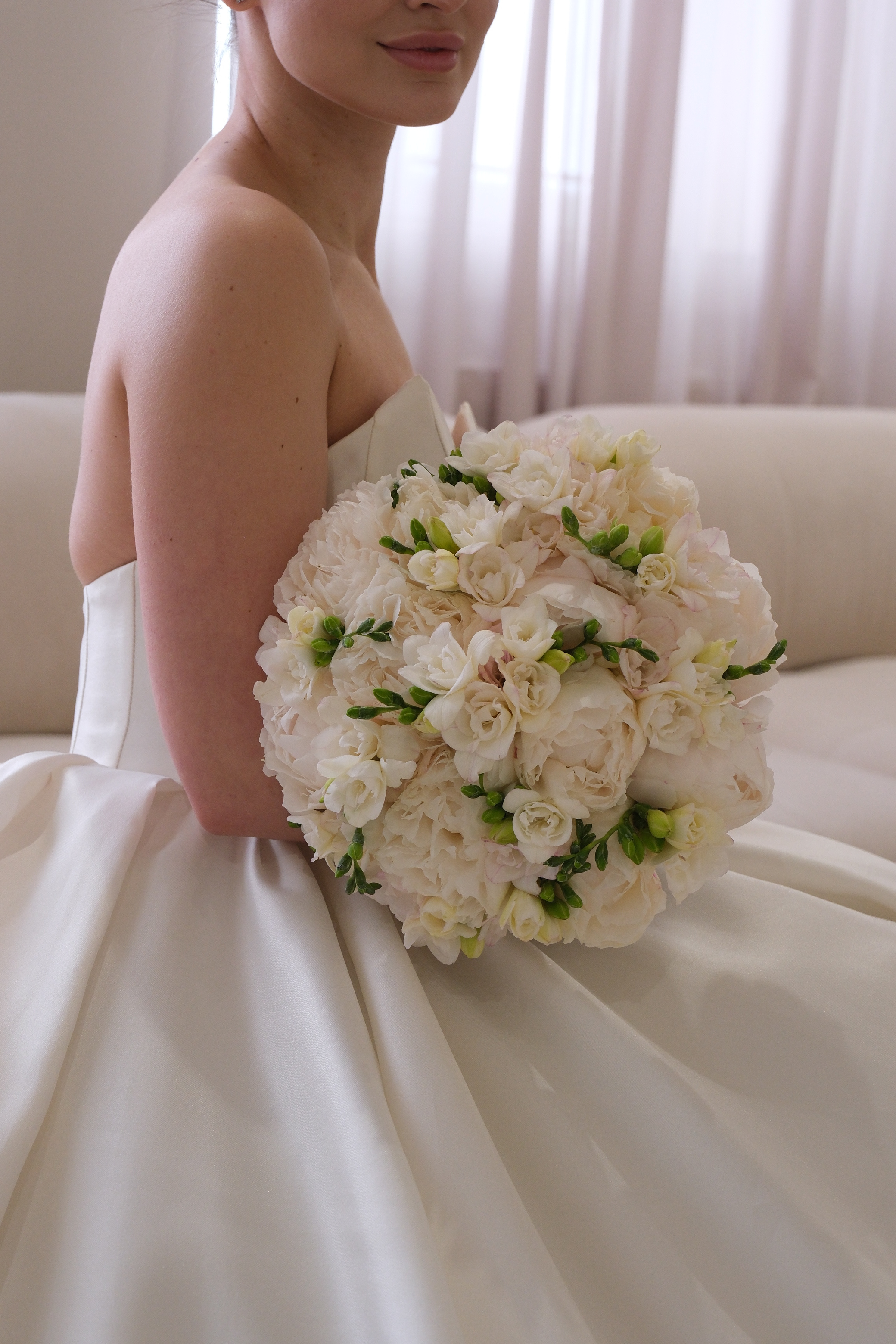 Чарівний весільний букет з півоній та фрезій – ідеальний вибір для нареченої! Створіть незабутній момент з цим елегантним букетом! Транспортувальна коробка захищає квіти, а підживка подовжує їх свіжість. Доставка по Луцьку та області.